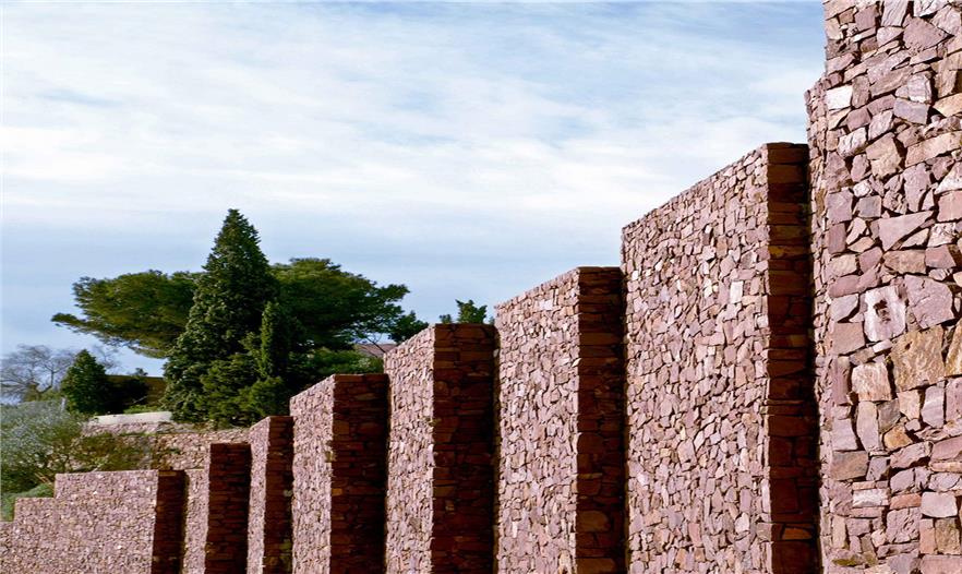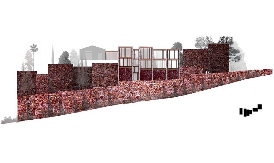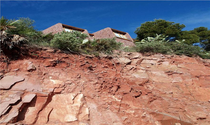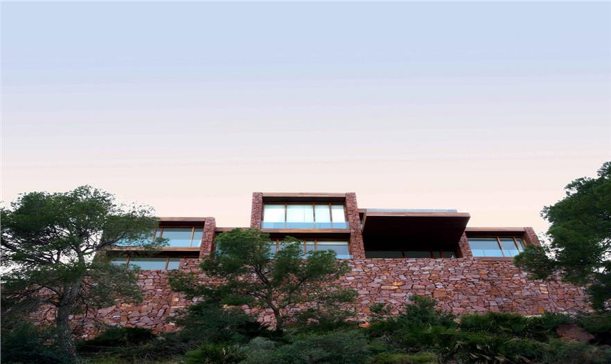 秀麗的山色和大塊石頭壘砌的擋土墻是這棟住宅的最初設(shè)計(jì)構(gòu)想。Paz & Comedias住宅坐落于巴倫西亞薩貢托的一個(gè)住宅區(qū),在卡爾德羅納山脈范圍內(nèi)。住宅利用在建工時(shí)挖取的紅砂巖,打造外立面砌體墻,與環(huán)境融為了一體。