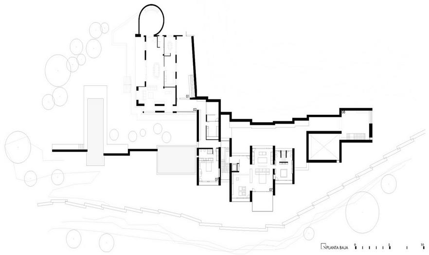 隔分空間的墻體相互平行,并與山坡面垂直。通過(guò)石材,住宅完美地融入到周圍景觀中。