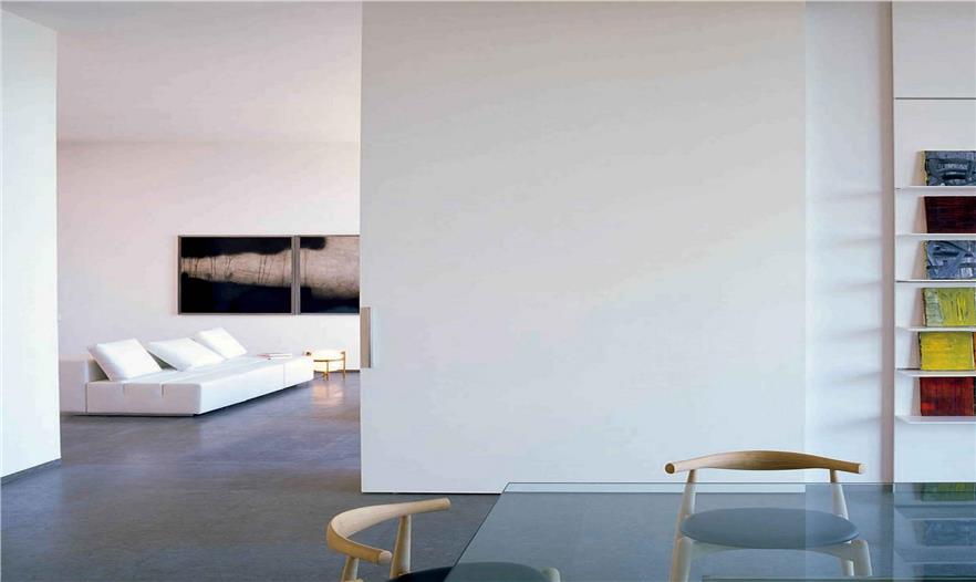 住宅內(nèi)部最大的特點(diǎn)是空間的流動(dòng)性。一些材料和元素運(yùn)用,比如墻體和玻璃開(kāi)口的布置,能夠幫助增強(qiáng)空間的連續(xù)性。地板和衛(wèi)浴壁櫥由灰色的烏利德科納石組成;外墻由綠柄桑層壓板外皮和紅色巖石墻拼接構(gòu)成;內(nèi)墻和家具都是白色,營(yíng)造一種寧?kù)o、流動(dòng)的氛圍。