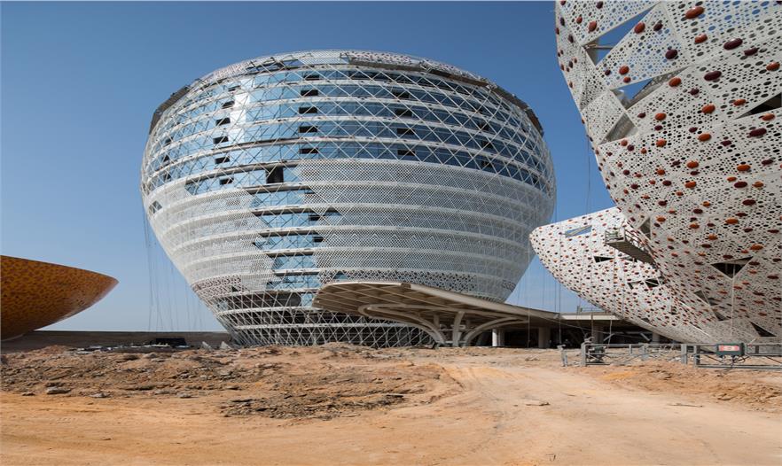 各功能區(qū)被置于圓形橫截面或幾何形模塊的體量?jī)?nèi)部。由于建筑單體的數(shù)量多于功能區(qū)的數(shù)量(主要功能區(qū)分為為:主入口、博物館、酒店、住宅),在建筑單體增加的同時(shí),逐漸顯露出一種自由的體系,從而在形成開放空間的同時(shí),亦在鄰近的建筑單體之間建立聯(lián)系,可稱為“鄰近空間”。