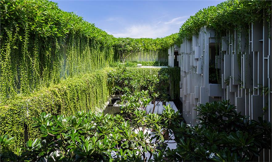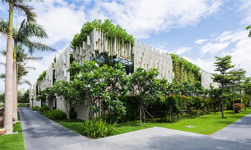 純凈水療中心位于越南峴港市,被精心打造成為一座寧?kù)o的綠洲,該水療中心15間水療方都被郁郁蔥蔥的花園包圍,每個(gè)水療室含兩個(gè)按摩椅和一個(gè)浴缸。其他公共空間比如健身房,冥想室,瑜伽俱樂(lè)部的場(chǎng)地都位于開(kāi)放式的花園中。蓮花池穿流其中,空中花園垂落其間,平靜,無(wú)處不在。