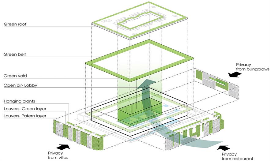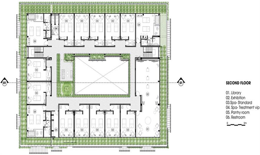 MIA建筑公司巧妙的利用自然通風(fēng)為這座建筑保持涼爽,并給客人帶來(lái)耳目一新的體驗(yàn),植物圍合出一個(gè)個(gè)私密空間,客人就在這無(wú)窮的綠意中健身療養(yǎng)。