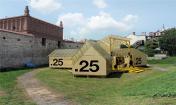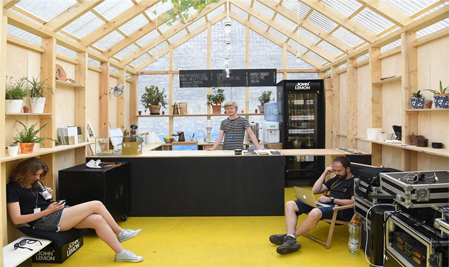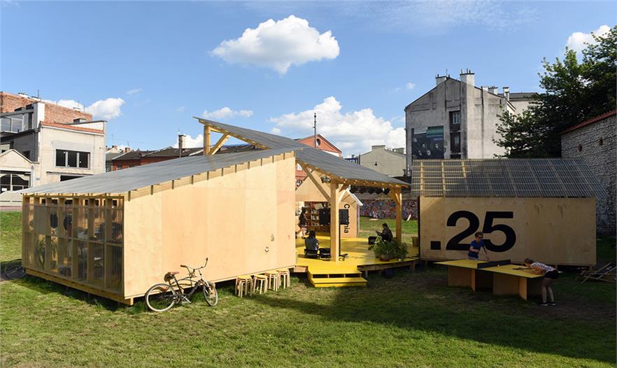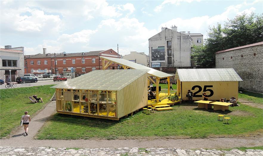 第25周年猶太文化節(jié)紀(jì)念活動(dòng)在克拉科夫的卡齊米猶太區(qū)慶祝,全世界各地的猶太人都匯聚到此處。BudCud需要在活動(dòng)廣場(chǎng)中設(shè)計(jì)了一個(gè)臨時(shí)的公共空間,遺憾的是,公共廣場(chǎng)被汽車,活動(dòng),還有商業(yè)行為所占領(lǐng),為此設(shè)計(jì)場(chǎng)地移到了猶太教堂后面安靜的Dajwor街,臨時(shí)建筑就在草坡上搭建起來(lái),占據(jù)著這個(gè)秘密花園。