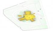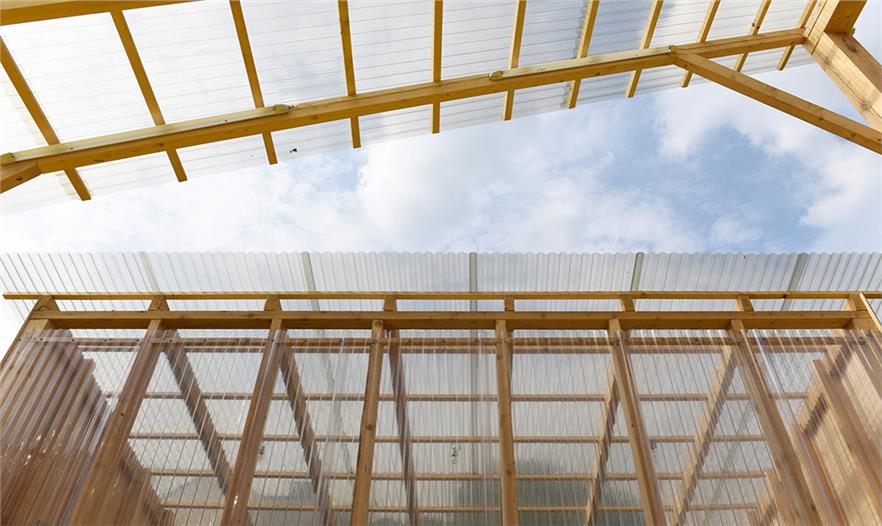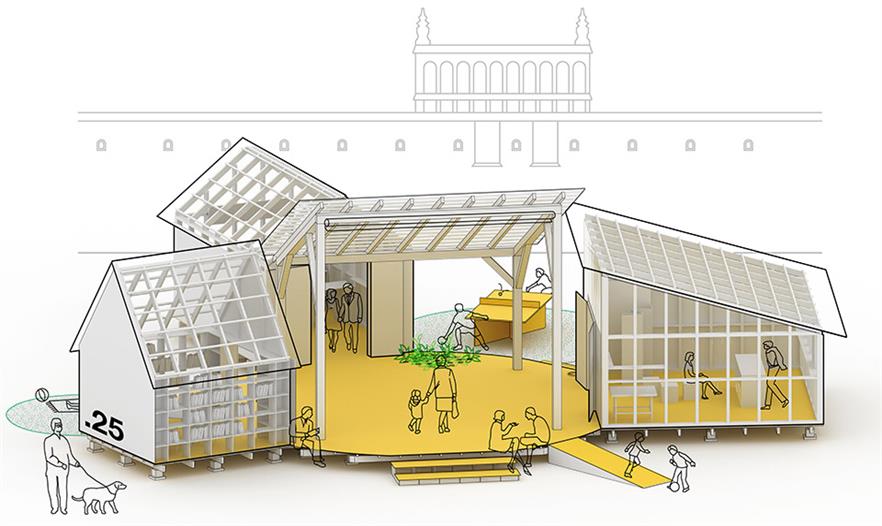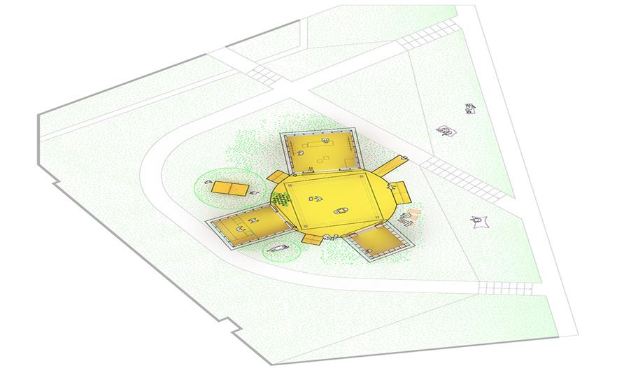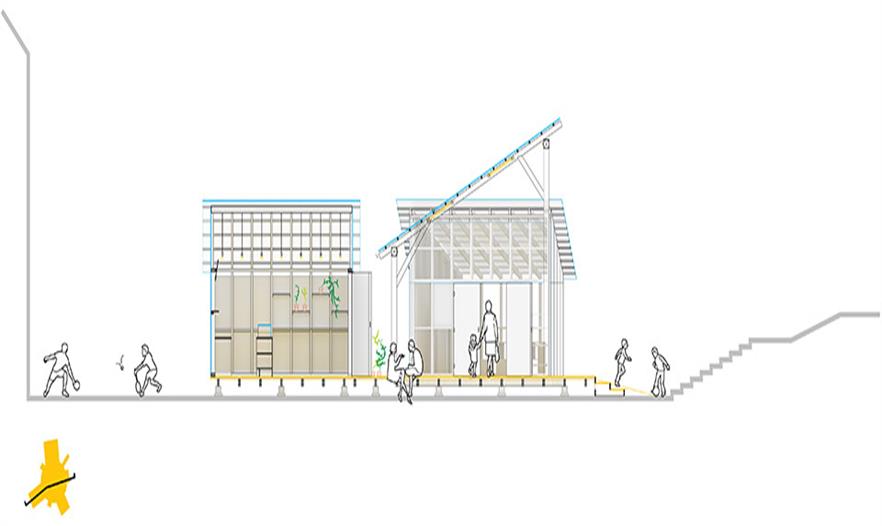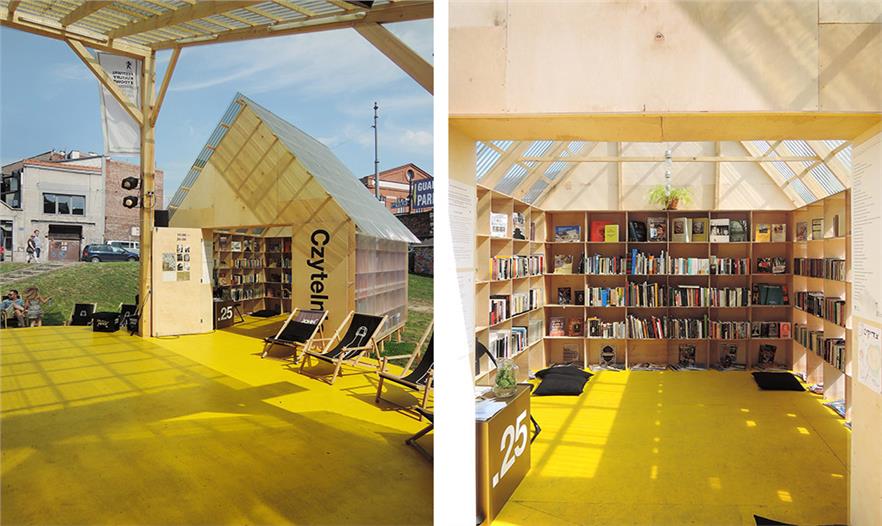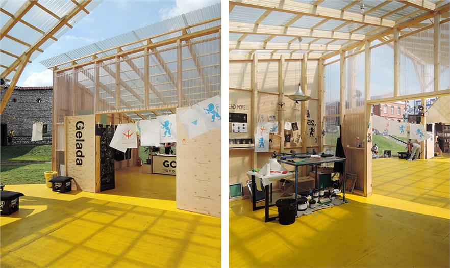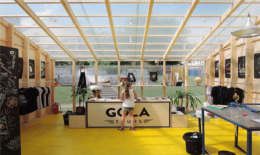 臨時(shí)建筑由三個(gè)建筑(咖啡館,社會(huì)圖書館,精品店)以及圍繞在他們中心的舞臺(tái)組成,人們通過(guò)斜坡進(jìn)入舞臺(tái),一側(cè)還有一個(gè)乒乓球區(qū)。結(jié)構(gòu)采用了木結(jié)構(gòu),板材采用了膠合板與塑料波紋板?;A(chǔ)為混凝土地基。地板被刷成明黃色,明亮的自然光線充斥在每一寸空間,到了夜晚,這是又變成惹人注目的城市燈塔和場(chǎng)景。