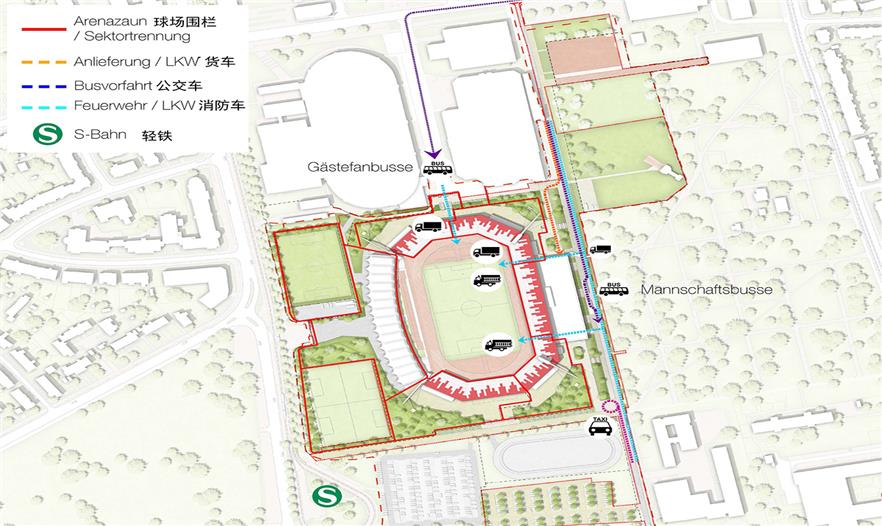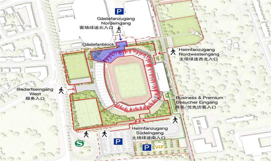 通過北面的大廣場和南面的出入口可以進(jìn)入體育場, 而歷史建筑馬拉松門就坐落于原露天站臺之間。當(dāng)球場周邊的流動空間需要開放和提供自由活動時,進(jìn)入球場的8個方向的入口將會被關(guān)閉。