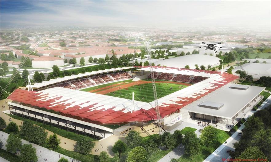 墨西哥風(fēng)的紅白圖紋的屋頂賦予了這座多功能體育場獨一無二的特征。梯形屋面下的主結(jié)構(gòu)分成左右兩個桁架,主支撐為混凝土結(jié)構(gòu),桁架為懸臂式鋼結(jié)構(gòu),整個東面的看臺屋頂部分由主場館,包括看臺, 主體建筑和屋頂來支撐,由此形成了一個既高效又經(jīng)濟(jì)的結(jié)構(gòu)解決方案。