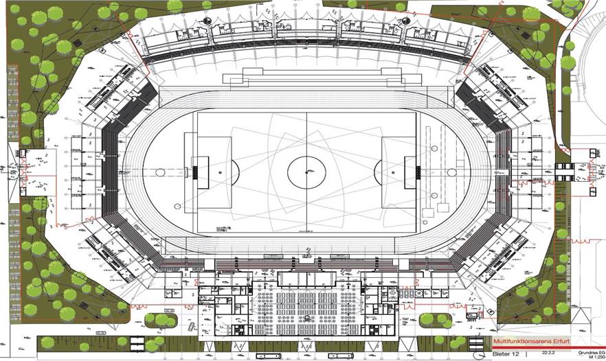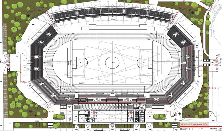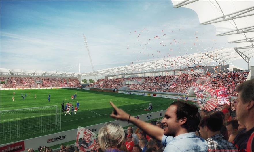 體育場坐落于圖林根州的首府, 這次擴(kuò)建的主題為熱情和靈活。熱情的主題體現(xiàn)在整個體育場將可以容納1.85萬觀眾。新看臺的屋頂與原來西看臺連成一體形成一個獨立的區(qū)域,更增添了體育場宏大的氣氛。 靈活性則體現(xiàn)在新的主場館可以提供舉辦各種活動和會議的場地。體育場不光是紅白埃爾弗特足球俱樂部(FC RWE)的主場所在, 同時也是各種國內(nèi)外體育賽事、音樂會、 各種大型會議和其他重要活動的最佳場所。