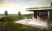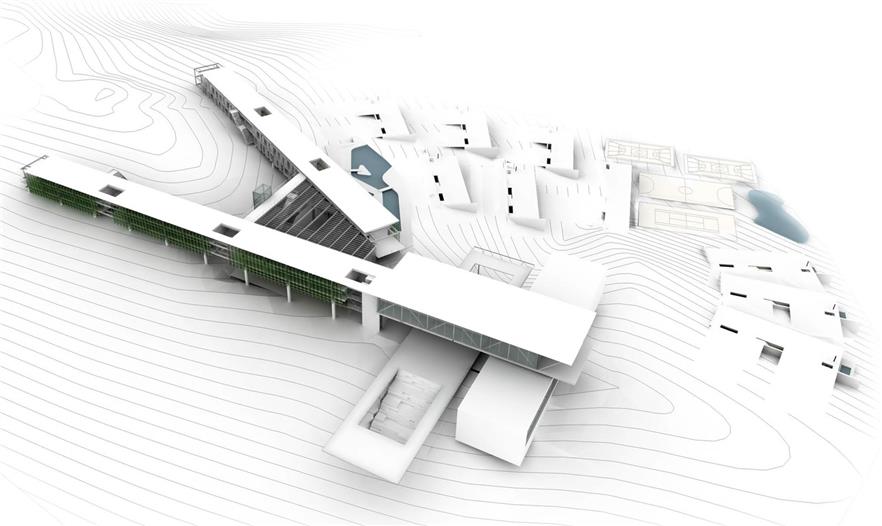這個酒店的主體位于該區(qū)域的最高點上,沿著中脊線劃分成兩條縱軸,適應自然地形。該項目與周圍景觀的互相尊重驗證了兩者之間的辯證關系;建筑對自然環(huán)境的沉思提供物質支持,而環(huán)境為建筑空間提供體驗的平臺。