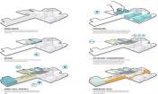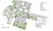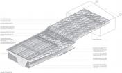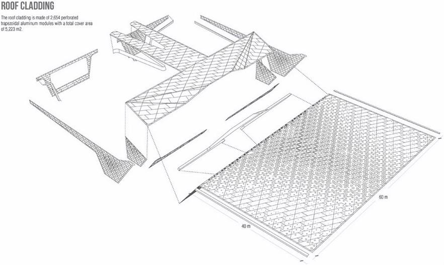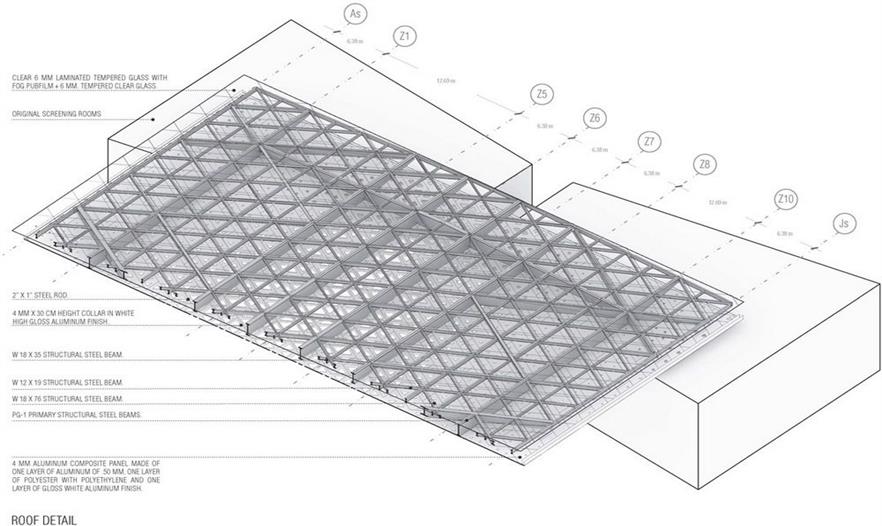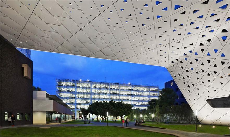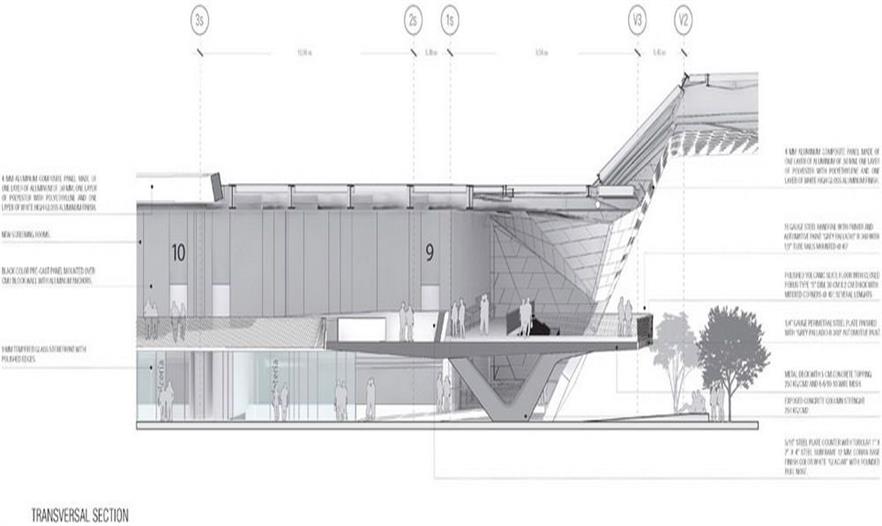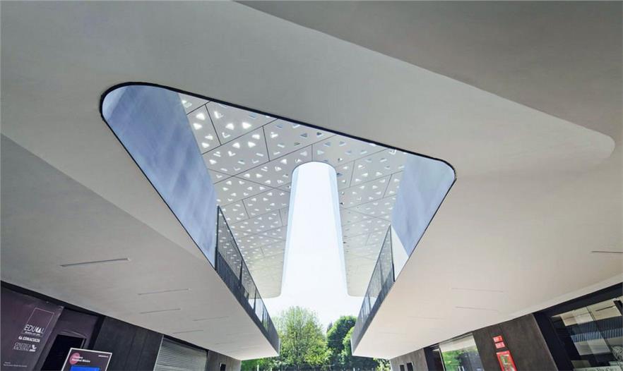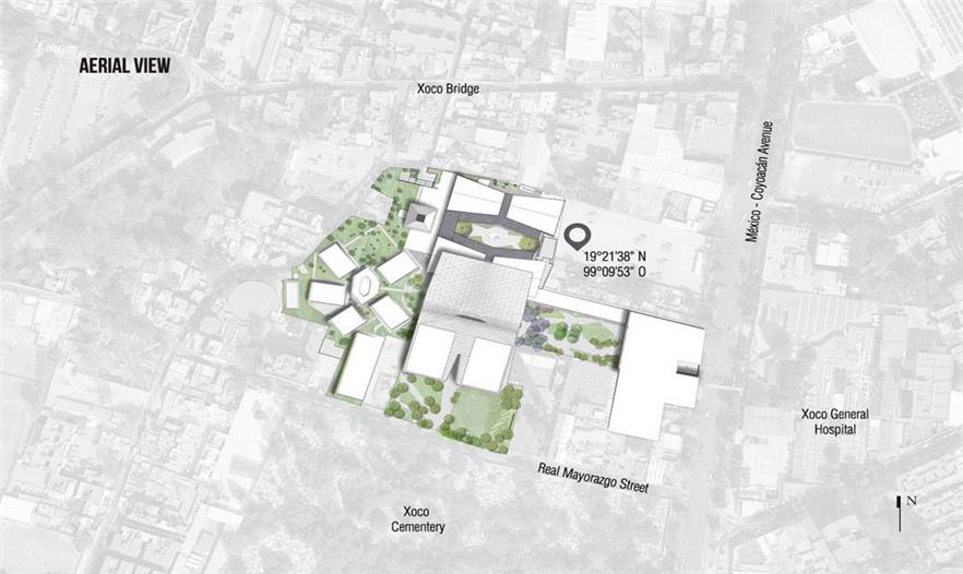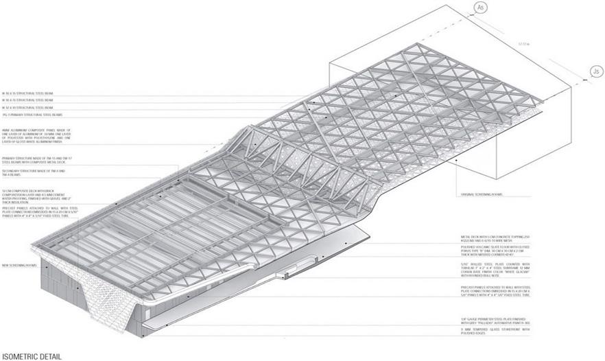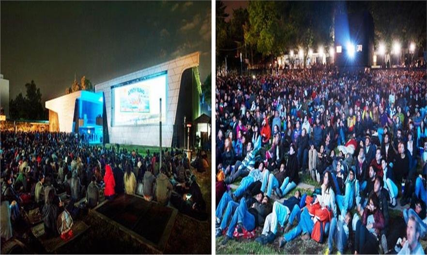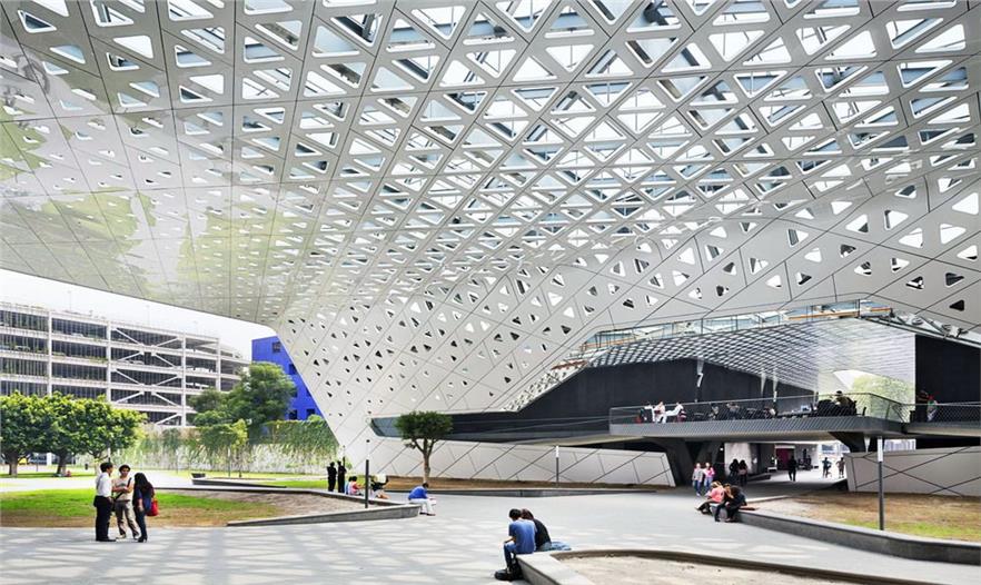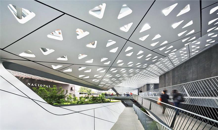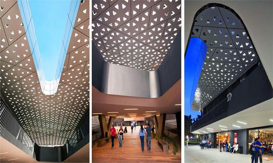 這個電影院占據(jù)墨西哥城國家電影資料館和墨西哥電影學(xué)院的部分場地,周圍綠蔭茂密,建筑風(fēng)光宜人,因此設(shè)計(jì)上將這個電影電視打造成為一個社會性的開放空間,具有浪漫的學(xué)院氣息。電影院的場地曾在1982年發(fā)生了一場火災(zāi),之后一直廢棄,成為趕往地鐵站和火車站的城市人群過境場地。新的設(shè)計(jì)將兩個放映院呈單獨(dú)體塊布置,之間和地面層加上咖啡廳這樣的公共活動營業(yè)場所,再使用一個80米×40米廣場天棚將新建組與對面的老建筑聯(lián)系起來。然后建筑師在場地中種上綠色植物,將服務(wù)空間布置在場地邊側(cè),形成環(huán)境宜人的開放整體構(gòu)架。天棚的材料是復(fù)合鋁塑板,上面有不同大小的三角形穿孔。這個電影院除了建設(shè)放映大廳之外,還建有戶外劇場,因此這里不再局限于放映電影,其邊界拓展到戲劇、展覽、音樂會等藝術(shù)內(nèi)容。