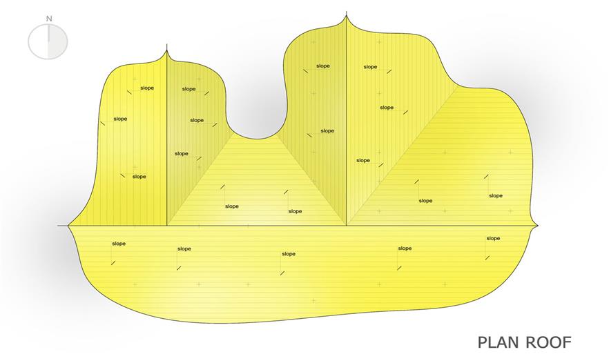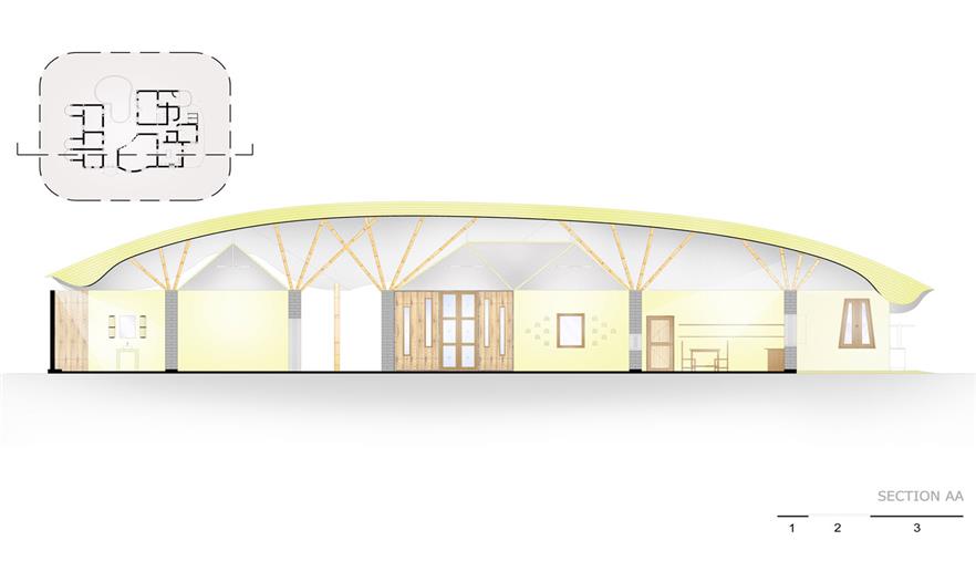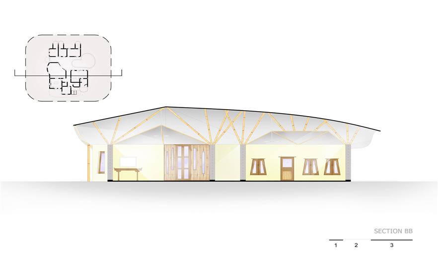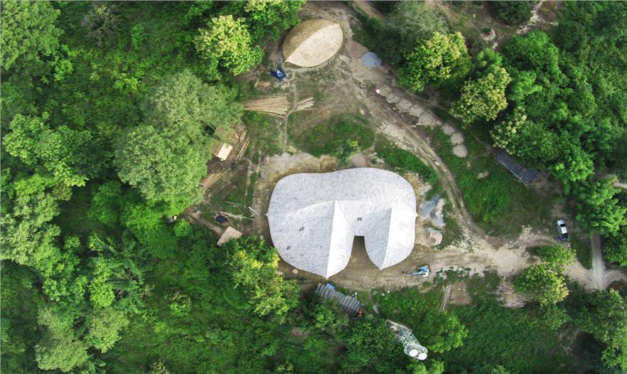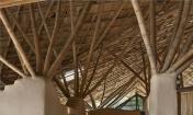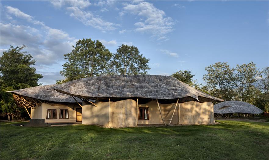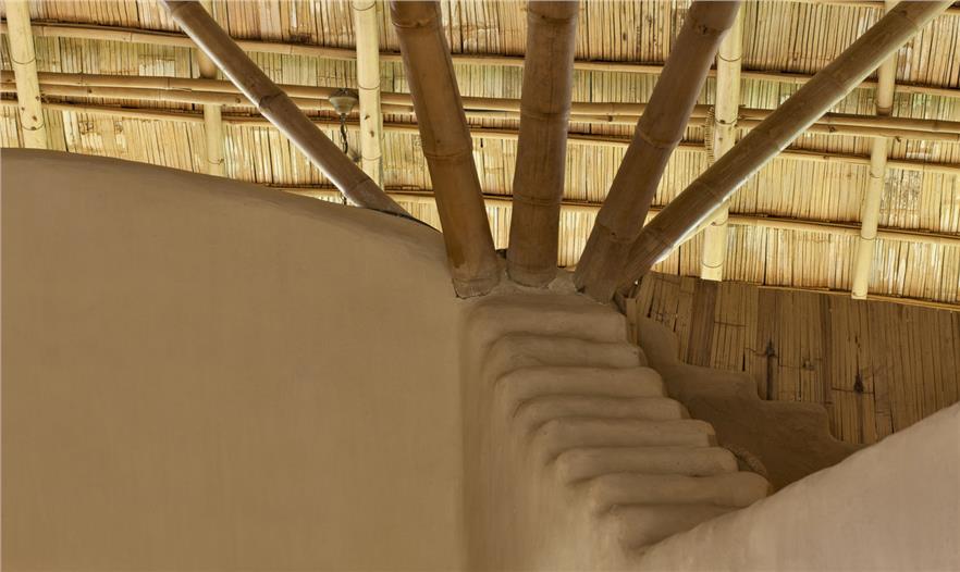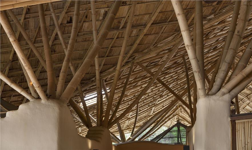 整座建筑的頂部被竹子制作的大“帽子”覆蓋,就像一把傘,遮陽擋雨。但這個設(shè)計絲毫不影響建筑內(nèi)部塑造出一種自然開闊的感覺、建筑中通風(fēng)良好,與外界相輔相成。建筑外墻采用的是風(fēng)干的磚墻,表面用白土粉刷,內(nèi)部的地板也部分采用了土質(zhì)以及混凝土混合物。