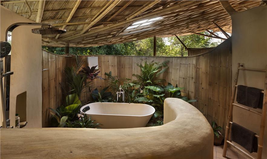 建筑大門采用了傳統(tǒng)的印度設(shè)計,有著相當(dāng)東方的感覺。 Trika住宅小別墅堪稱是現(xiàn)代熱帶建筑的典范,與周邊自然環(huán)境融洽度極高。