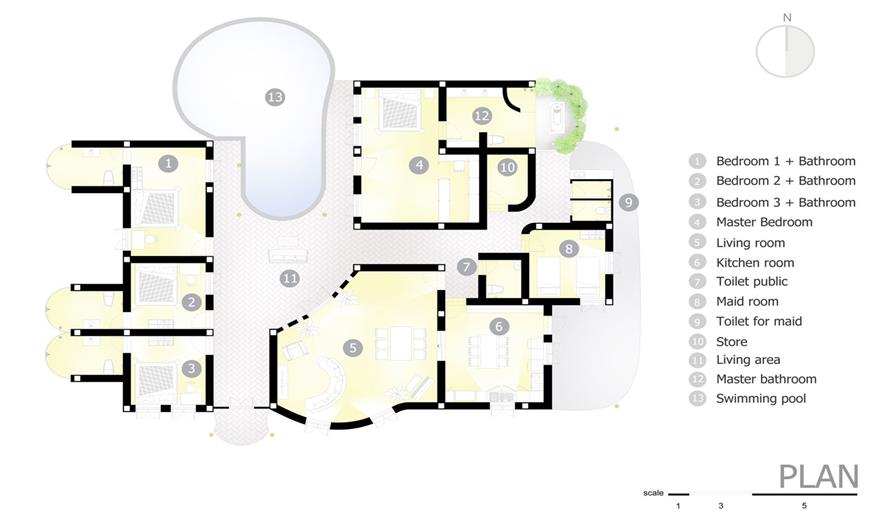 這座名為Trika的住宅小別墅,配備了五間臥室、五間浴室、一間超大的起居室及餐廳、一座現(xiàn)代化的廚房及屋外的活動區(qū)域及一個游泳池。清邁生活建筑事務(wù)所在這座21世紀(jì)新概念住宅中采用了泥土及竹子這類的環(huán)保材料。
