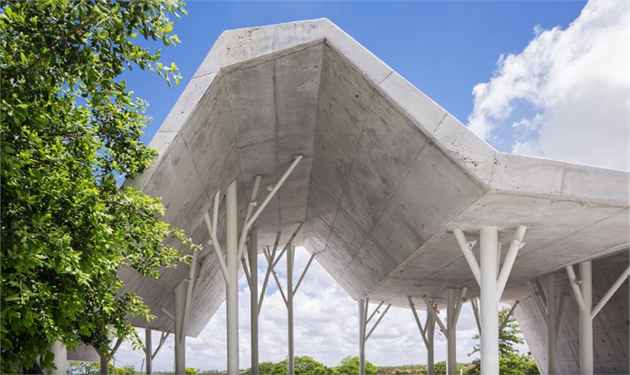 在設(shè)計期間,事務(wù)所考慮到了周圍的事物,想要豎立一塊紀(jì)念碑,以此紀(jì)念因城市再利用而被破壞的鄉(xiāng)村環(huán)境。這座紀(jì)念碑包括一塊暴露在外的混凝土塊,象征建筑的擴張,通過樹狀的鐵柱(代指被砍伐的樹木)支撐。這個結(jié)構(gòu)里面還有一棵橡樹,樹上的屋頂是開放的,供樹木生長,建立樹木與鋼鐵標(biāo)志之間的聯(lián)系。