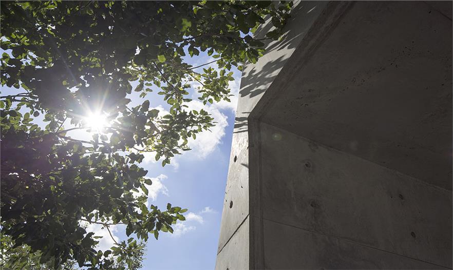 建筑北側(cè)有一條混凝土帶,自西側(cè)地下一直順著窗戶向上攀爬直到屋頂、天花板和墻上,最后又回到地面,就像人從塵土中來,最后又歸于塵土。建筑的材質(zhì)和色調(diào)是單色的,大部分為灰色,帶來一種整潔、中性和悲傷之感。
