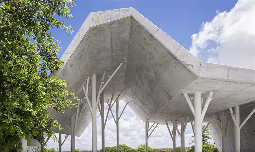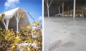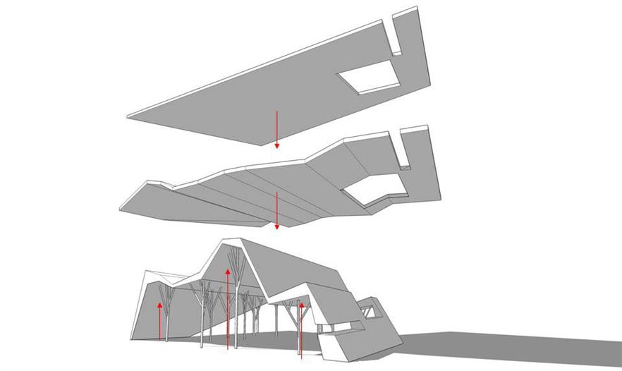 計劃和施工過程:通過電腦軟件設(shè)計超過300塊大小形狀不一的板材,最終拼裝出該建筑。將這些板材運送至工地由施工隊拼裝完成。將金屬樹結(jié)構(gòu)運送至工地并按照設(shè)計進行拼裝。利用剩余板材將墻筑好后,工程師對所有鐵工和結(jié)構(gòu)設(shè)計進行批復(fù)認可?;炷翝仓w和屋頂在一天內(nèi)完成。
