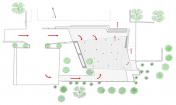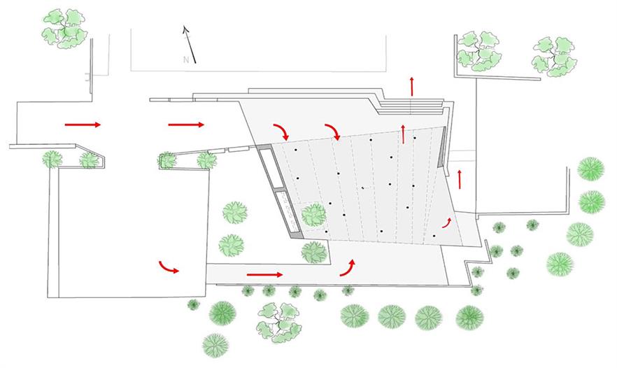 建筑有兩個入口,其中較小的供逝者家屬使用。 另一個較大入口供其他送葬者使用,該入口可直達空曠建筑。此建筑正面朝北,此面為全開放式,它的位置也使一些追悼者可保持一定距離參與葬禮,同時在建筑外提供了一片蔭蔽區(qū)域。共有兩個出口通向葬禮區(qū),其中一個方便進出,到達另一出口需經(jīng)過一段樓梯。