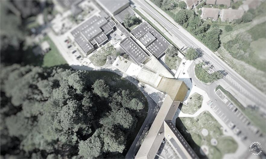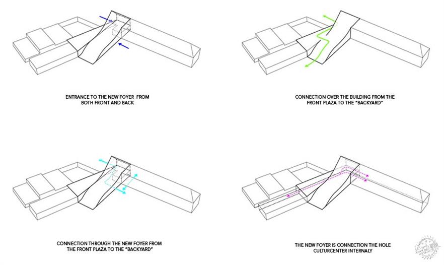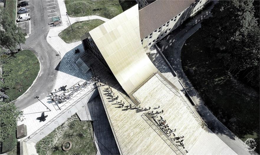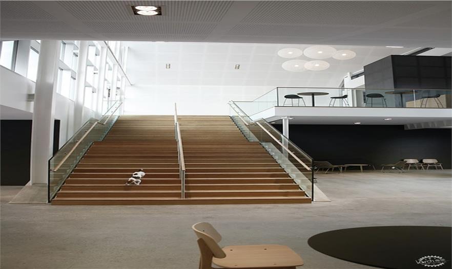 文化中心在終點(diǎn)區(qū)文化廣場(chǎng)和Mariehøj美麗的后院之間的缺口上建橋,與綠色景觀融為一體。建筑對(duì)周圍環(huán)境呈開(kāi)敞之勢(shì)并使建筑內(nèi)的活動(dòng)也具備綠色品質(zhì)。