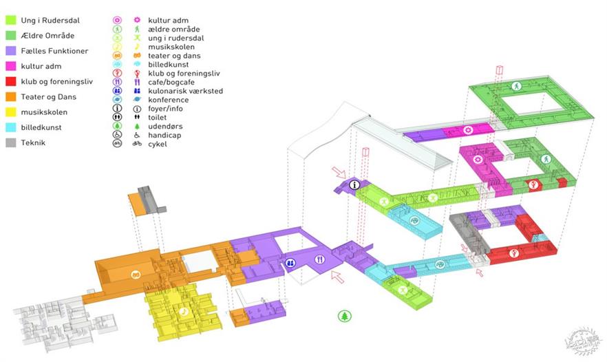Mariehøj文化中心描繪了一個(gè)輪廓分明的景觀。新的大廳迎接Rudersdahl市所有的民眾并作為功能中心,帶動(dòng)所有的人一起,凸顯眾多的用戶和建筑內(nèi)的活動(dòng)。