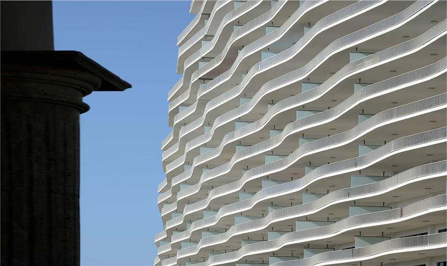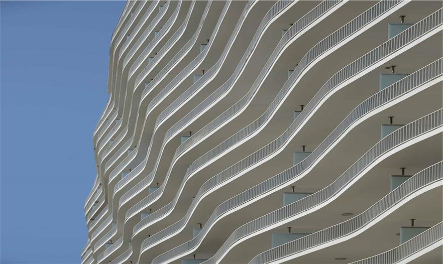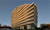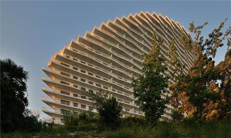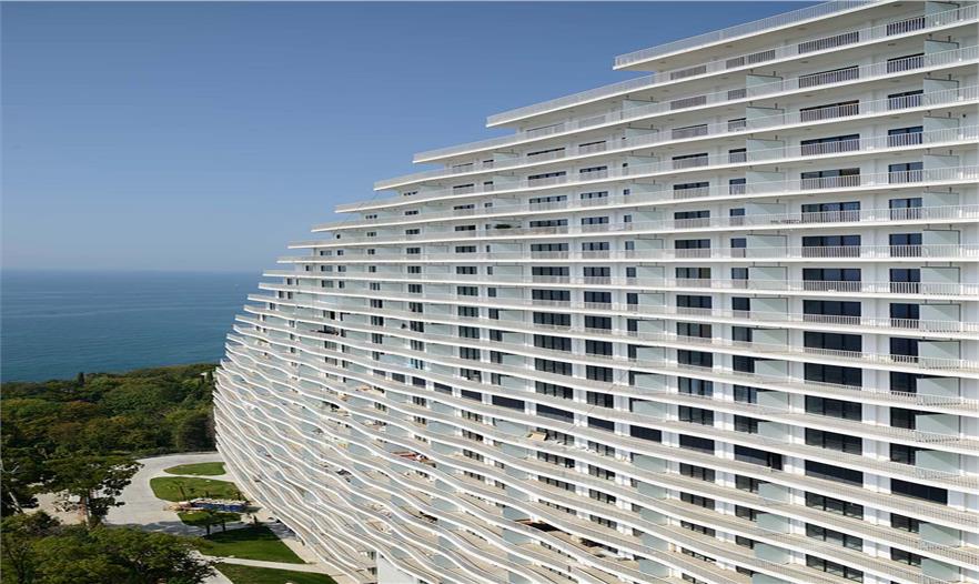 其雕塑般的結(jié)構(gòu)通過(guò)建筑側(cè)立面波狀起伏的階梯狀線條得到了增強(qiáng)。有趣的是,這個(gè)“波浪”從地面又返回到地面,使表面更加生動(dòng),就像海風(fēng)吹拂激起的漪漣一樣。度假主題也透過(guò)建筑群的白色顯示出來(lái)——由于動(dòng)態(tài)結(jié)構(gòu)和尖頭,雪白色的建筑在索契的全景中更加亮眼,就像揚(yáng)帆起航的輪船一樣。