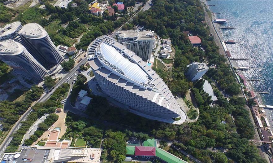 該建筑位于索契,在蘇聯(lián)時(shí)期是很有名的演員療養(yǎng)度假村地區(qū),占據(jù)著該地塊的上層區(qū)域。其急劇的下滑結(jié)構(gòu)直接影響著建筑和結(jié)構(gòu)設(shè)計(jì):該建筑的布局構(gòu)成細(xì)長(zhǎng)的下滑形式,就像下滑的斜坡一樣。該建筑群的輪廓增強(qiáng)其動(dòng)態(tài)性:其朝向海洋的一面逐漸變細(xì),所以 Actor Galaxy建筑群一層層降低,在該城市的天際線中營(yíng)造出壯觀的拱形。