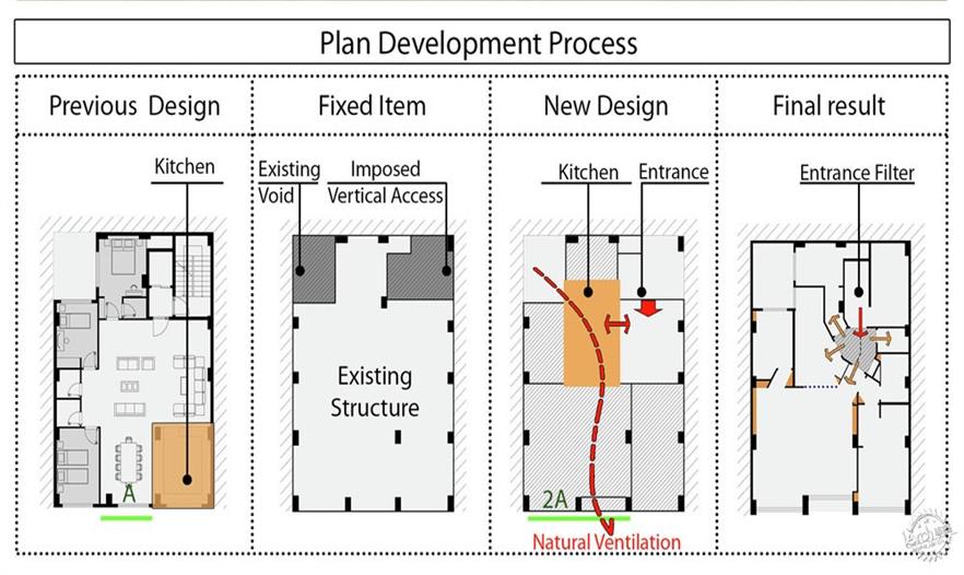 設(shè)計師在組織內(nèi)部空間時,隱私仍然是主要目標(biāo),尤其是在入口處,一個旨在提供方便訪問其它空間(尤其是廚房)的過濾空間。這個過濾空間是由伊朗當(dāng)?shù)亟ㄖ玫絾l(fā)而設(shè)計的。