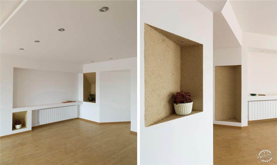 體塊之間的壁龕設(shè)計提供了放置機(jī)械設(shè)施、裝飾物品和照明裝置的位置。廚房相鄰的空缺位置,可以提供充足的光照和自然通風(fēng)。