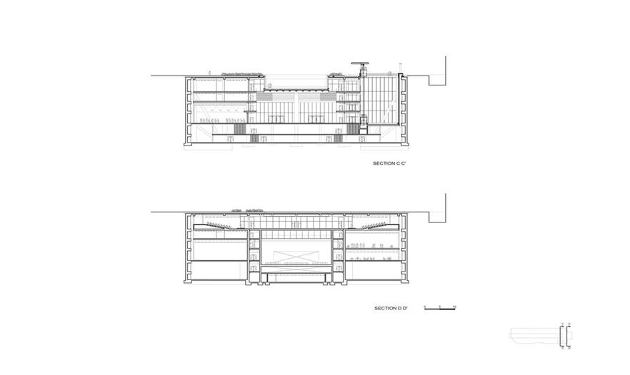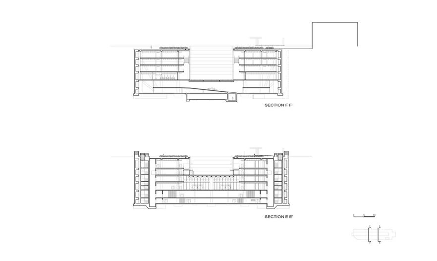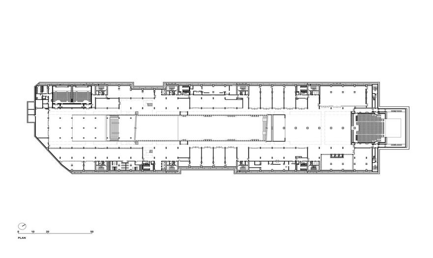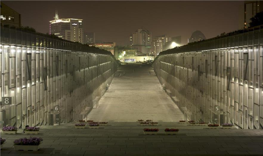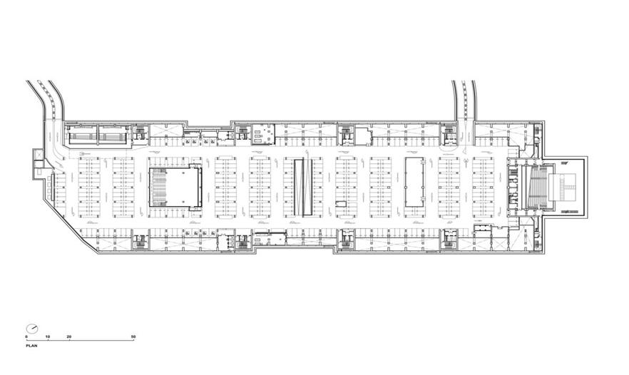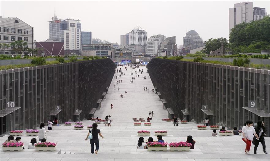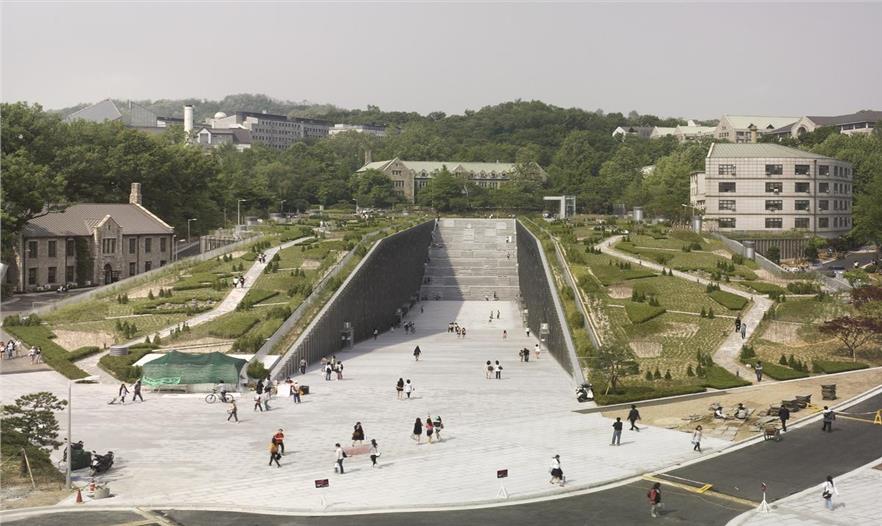 一條裂縫切入了梨花女子大學(xué)校園中心的地形,形成了一處新的空間,一個(gè)混合型的場(chǎng)所,其中可以進(jìn)行各種活動(dòng)。它也是這樣一條大道,緩緩下降,控制人流,最終來(lái)到一條具有儀式感的階梯,引領(lǐng)游客上行,讓人聯(lián)想起香榭麗舍大街或是羅馬的 Campidiglio 廣場(chǎng)。