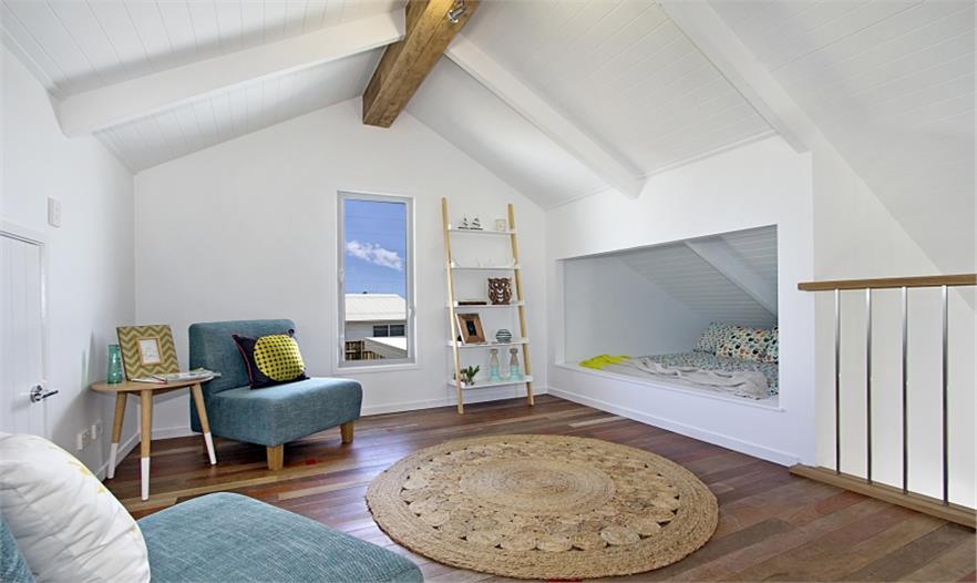 這個(gè)房屋的特色是高聳傾斜的屋頂,設(shè)有裸露的椽子、鄉(xiāng)村式的木梁、30度的斜尖屋頂,還有高高的百葉窗,在夏季期間清除熱空氣。