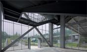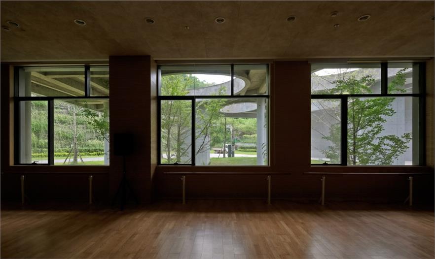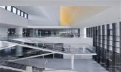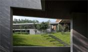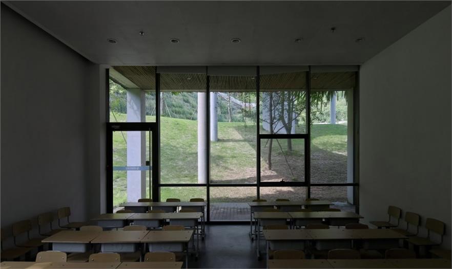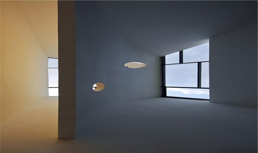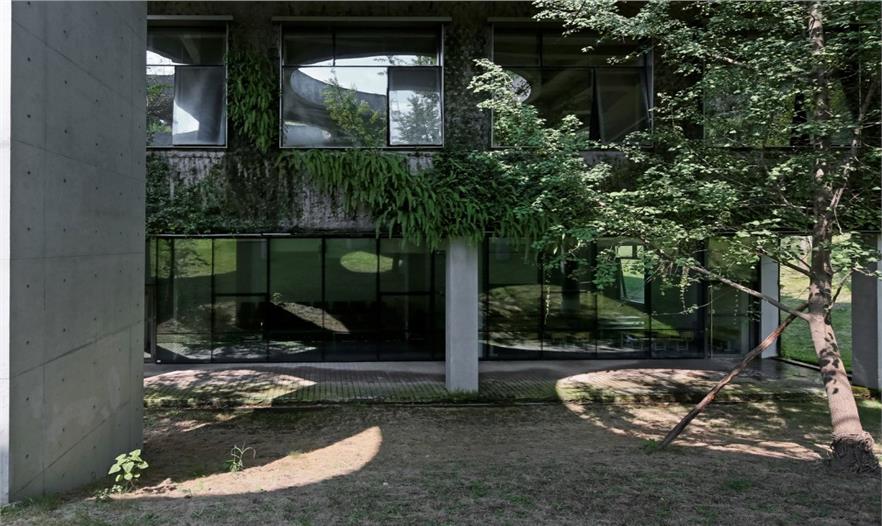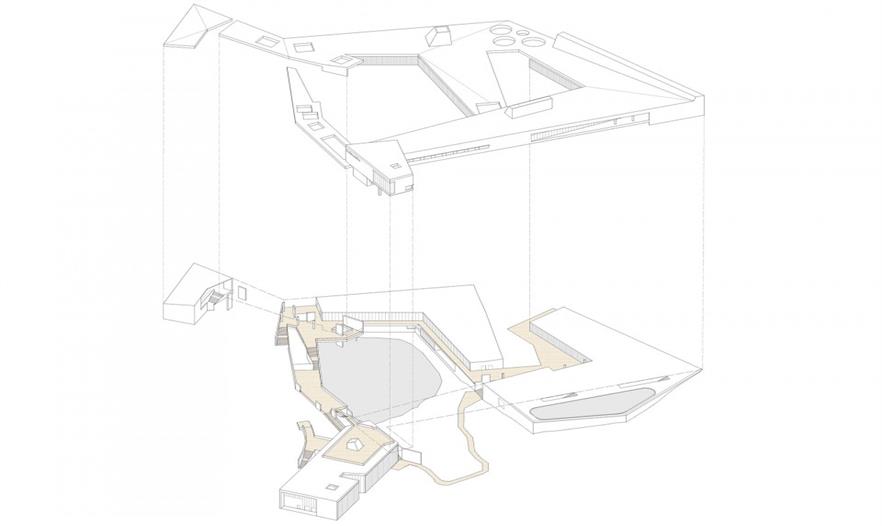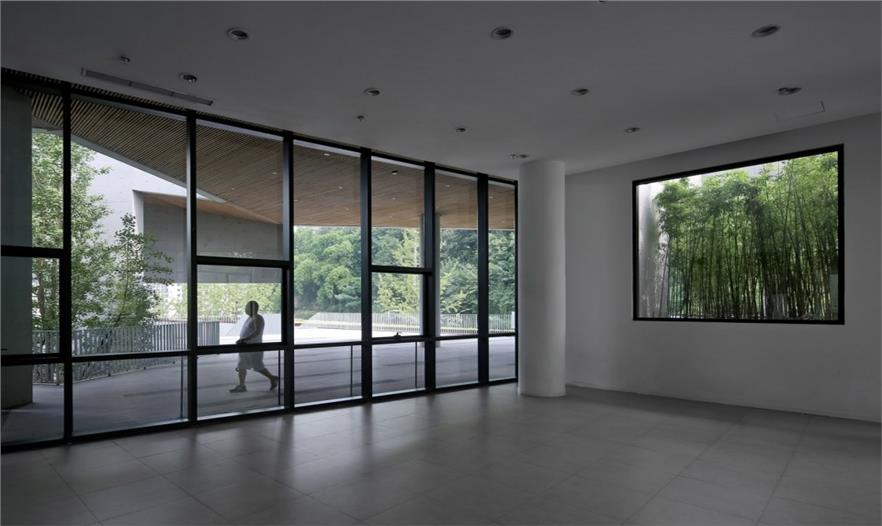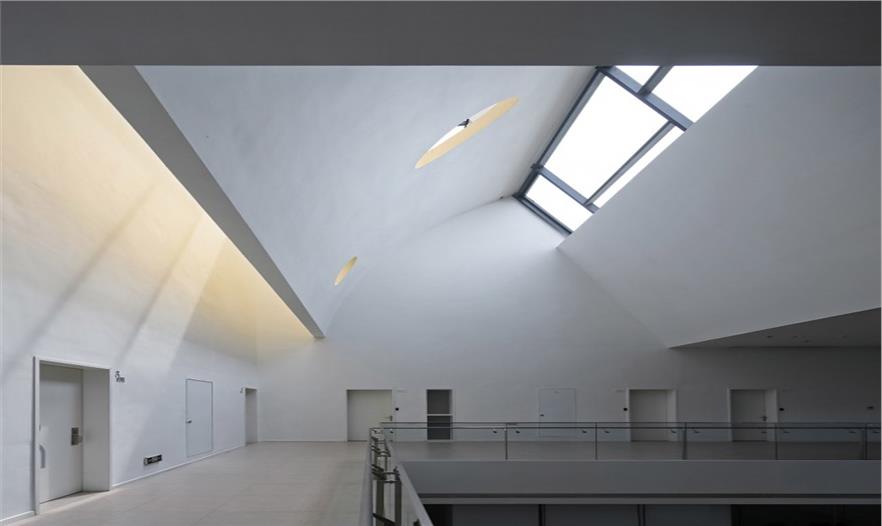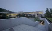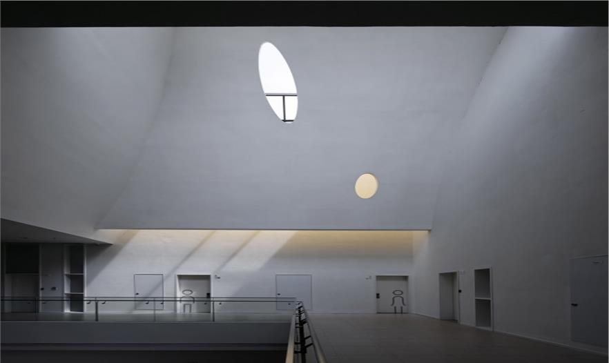 三個(gè)基本功能中各自都有一個(gè)中庭空間,分別通過一個(gè)大尺度的天窗將自然光線引入內(nèi)部。我們希望通過這一系列在頂板和墻體上的洞口、窗口、架空、回廊弱化建筑內(nèi)外的邊界,使整體空間與天空、山景、樹木、陽光和風(fēng)相匯交融,最終創(chuàng)造一種人工與自然之間生機(jī)勃勃的共生關(guān)系。