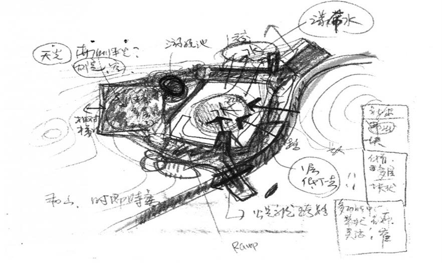 社區(qū)中心考慮了三種人流的停留、穿越和混合,公園里休閑娛樂的市民,附近社區(qū)的居民,和社區(qū)中心的使用者和管理者,他們各自承載著不同的行為方式,包括散步、鍛煉、集會(huì)、演出、閱讀、課外輔導(dǎo)、培訓(xùn)、戶內(nèi)健身、基礎(chǔ)醫(yī)療,等等。這些人和活動(dòng)既有相對(duì)限定的位置和區(qū)域,又可以在一個(gè)開放流動(dòng)的空間架構(gòu)中產(chǎn)生積極的互動(dòng)。歸根結(jié)底,我們希望社區(qū)中心能夠成為一個(gè)激發(fā)公共能量的城市節(jié)點(diǎn)。