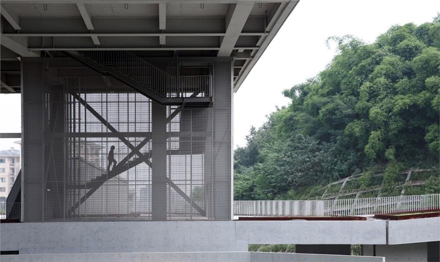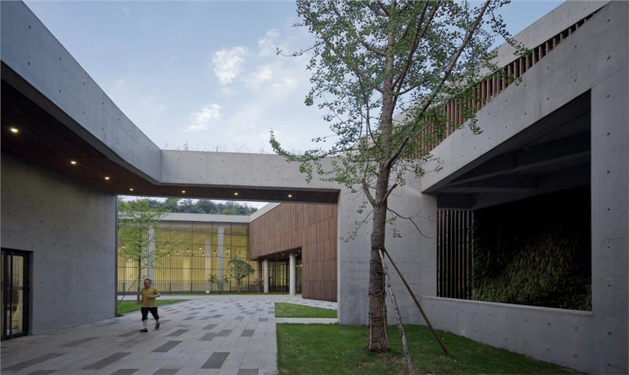 由于多雨氣候的影響,重慶當(dāng)?shù)貍鹘y(tǒng)建造中存在著大量的類似“風(fēng)雨騎樓”的半戶外行走空間。這一空間類型也被延續(xù)到該社區(qū)中心戶外空間串聯(lián)的交通組織方式之中。兩個(gè)庭院與建筑四周有多條線路相連接,并通過大尺度的洞口與架空,從視線和流線兩個(gè)層面,將內(nèi)外空間緊密聯(lián)系在一起。