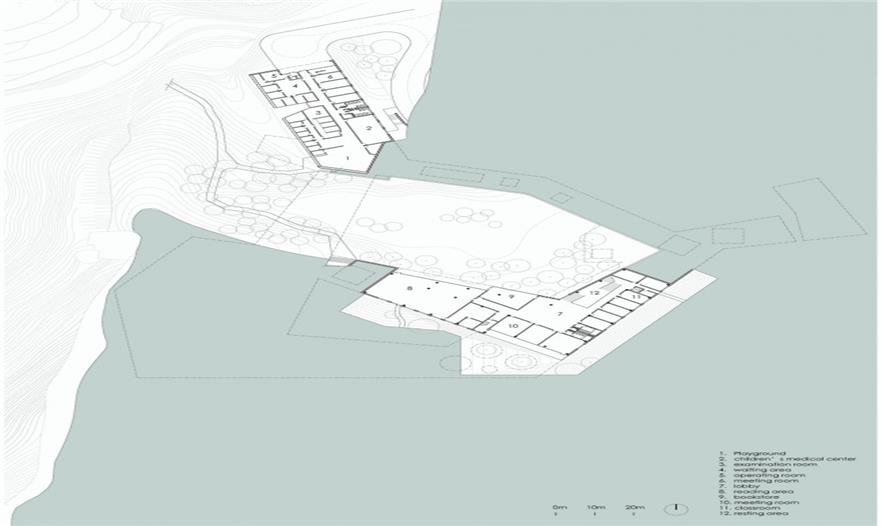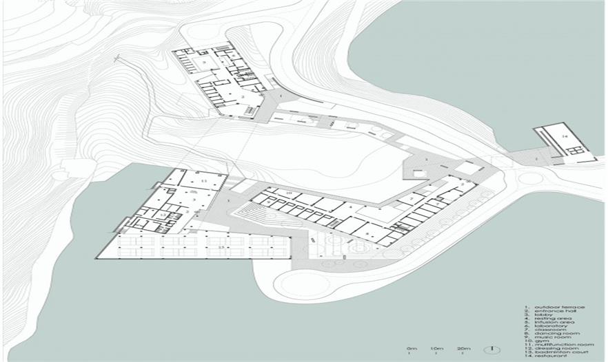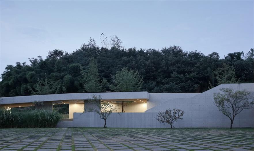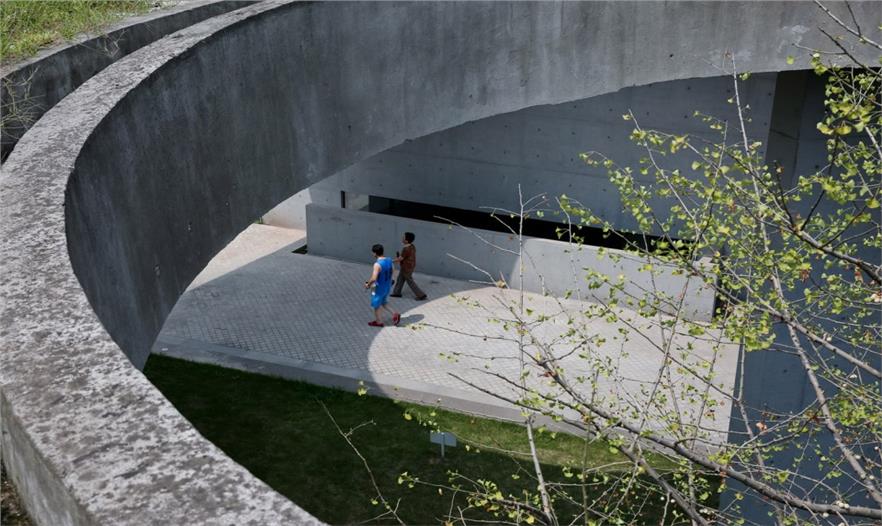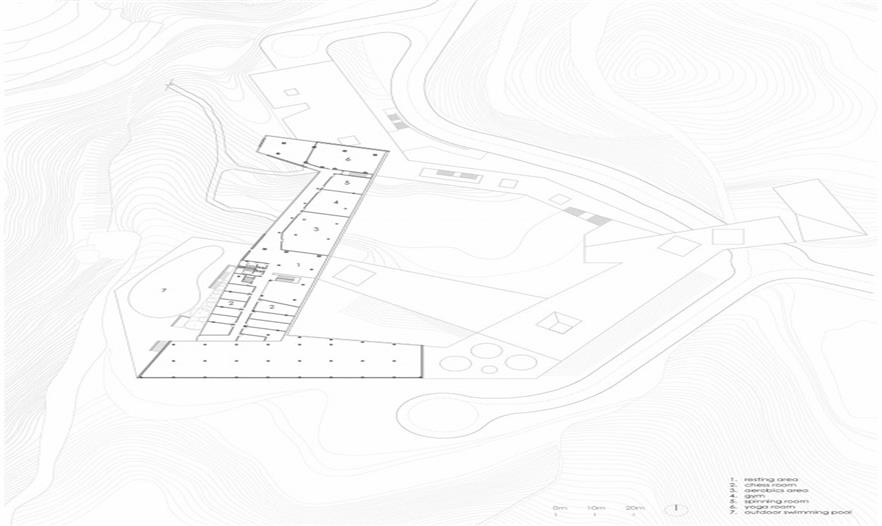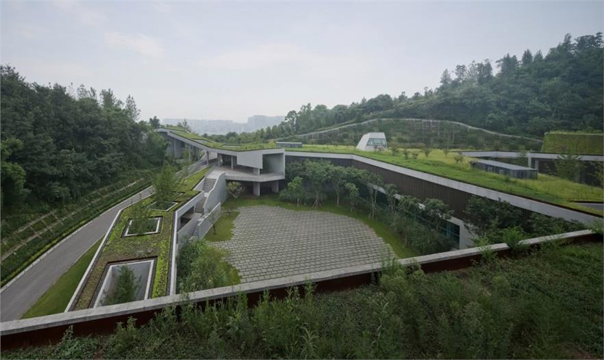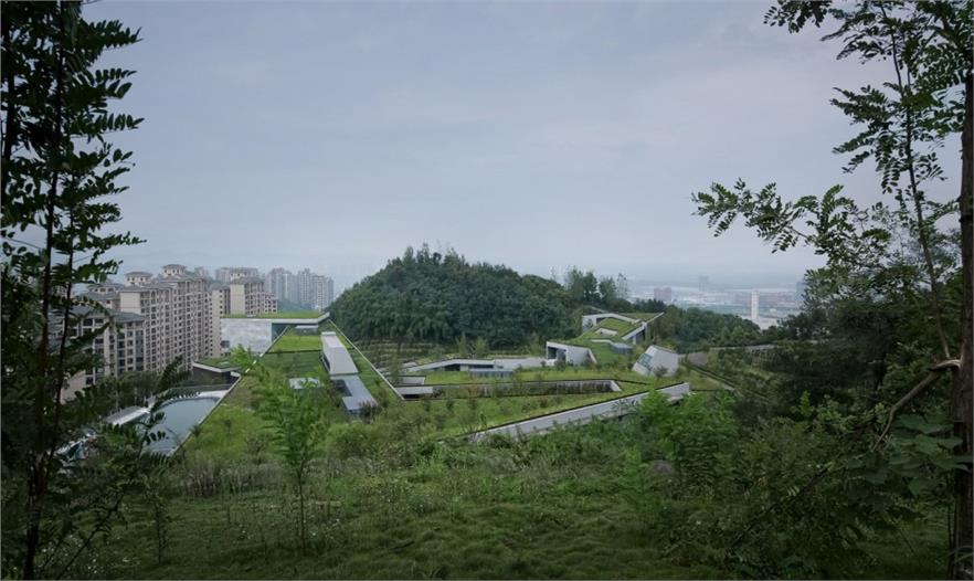 社區(qū)中心位于重慶市桃園公園半山腰上的一塊洼地,四周被起伏的山形圍合。對(duì)我們而言,設(shè)計(jì)所面對(duì)的首要問題是新的空間建造以什么樣的態(tài)度介入到原始地貌之中。非同于“在山上蓋一幢房子”的通常做法,我們希望塑造一個(gè)建筑整體趨勢和山體相融合的景觀意象。新的空間形體依順著山勢而規(guī)劃,它們的輪廓線和原來的山形融匯相映。整體建筑采用綠色植被屋頂和局部的垂直綠化墻體,進(jìn)一步強(qiáng)化了建筑與自然山體共存的想法。社區(qū)中心包括文化中心、體育中心、社康中心三個(gè)基本功能,由于管理的需求,各自獨(dú)立,但被一個(gè)連續(xù)的屋頂所覆蓋。建筑整體呈環(huán)狀布局,兩個(gè)庭院空間被圍合于其中,一個(gè)是坡地花園,另一個(gè)是可以容納社區(qū)生活與集會(huì)活動(dòng)的綠化廣場。