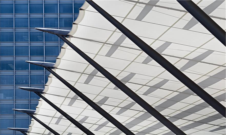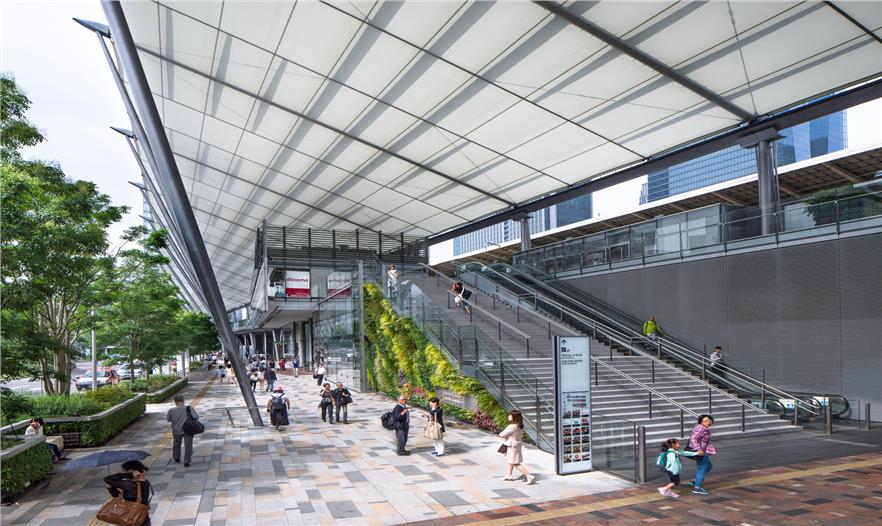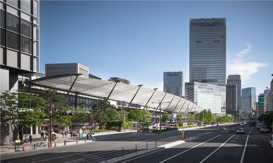 對(duì)很多游客來(lái)說(shuō),車站是對(duì)這個(gè)城市的最初和最終印象。盡管位于老車站旁邊,它定義并從丸之內(nèi)區(qū)一直到西邊的地段區(qū)分開了八重洲區(qū),并使之與眾不同。建筑中采用的可持續(xù)性和低成本維護(hù)技術(shù)在頂棚的設(shè)計(jì)中綜合的體現(xiàn)出來(lái);在兩座變換的大廈中利用一條直線形來(lái)體現(xiàn)建筑的簡(jiǎn)潔設(shè)計(jì)。234米長(zhǎng)的華蓋頂棚被設(shè)計(jì)成一個(gè)巨大的織物平板,軌跡邊緣被固定在一條直線上,由間隔18米不同高度和角度的鋼骨架支撐。高度和角度的變化讓頂棚顯得簡(jiǎn)單而不普通??椢锇鍛覓煸阡摷芙Y(jié)構(gòu)上,使得頂棚表面形成一個(gè)連續(xù)的發(fā)光平面。結(jié)構(gòu)通過(guò)織物表面可以被看得一清二楚,也可以被解讀成葉子的經(jīng)脈,頂棚下方的結(jié)構(gòu)為兩棟辦公樓、車站和零售商店設(shè)置了一個(gè)二層連接通道。