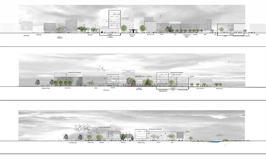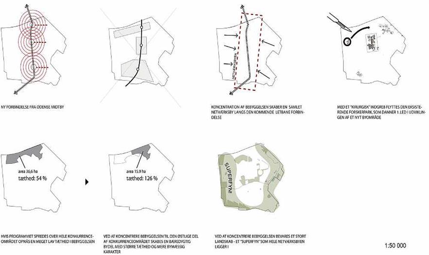 這個概念意味著將10萬平方米的研究和科學(xué)設(shè)施與另外10萬平方米的公共空間、住宅區(qū)、學(xué)生宿舍、機構(gòu)和酒店混合建在這個緊密的城市環(huán)境中。這個概念會獲得明確、簡潔的可持續(xù)性回報,如緊密的建筑、短途服務(wù)路線、最小化的基礎(chǔ)設(shè)施、最小化的土地利用以及良好的城市小氣候。它也可以讓各種用戶密切接觸以及將科學(xué)研究與周圍社區(qū)結(jié)合的潛力。在這里學(xué)生、老年人聚集,還能觸發(fā)商機,構(gòu)建丹麥未來的知識社會。這個方案建造出一個真正的城市裝置,所有的外向活動都安排在地面上的小型和大型的公共空間里進行。
