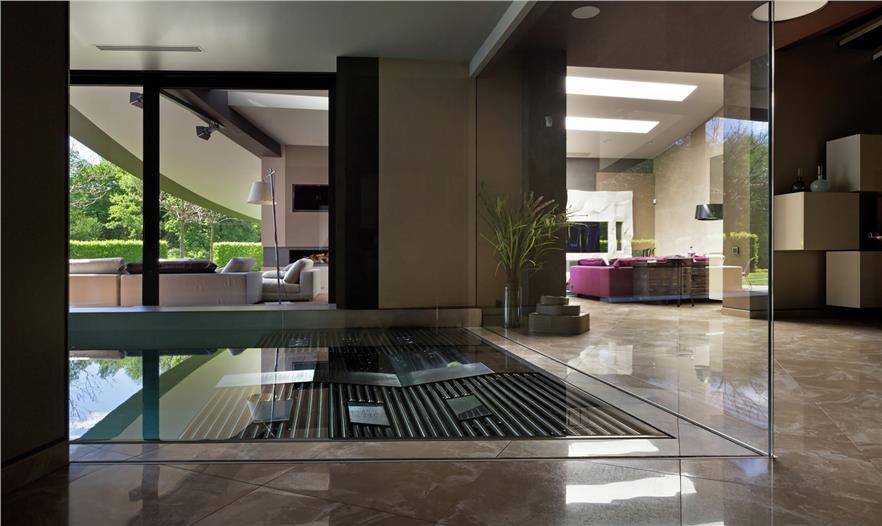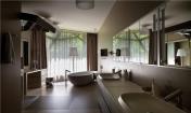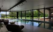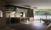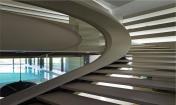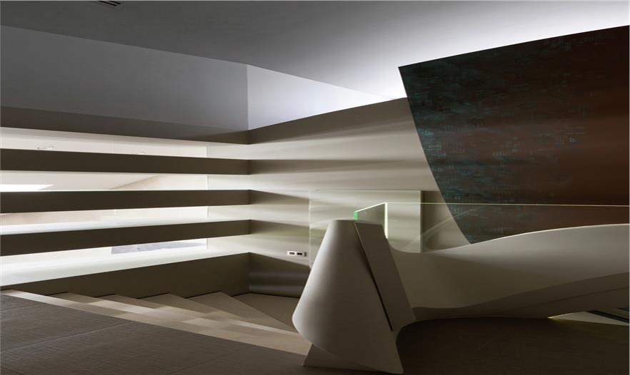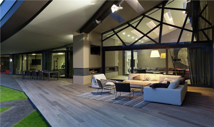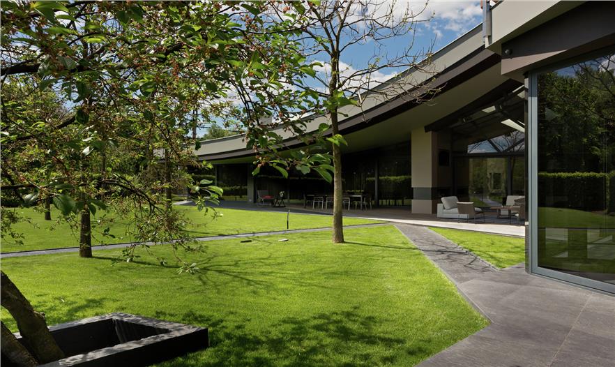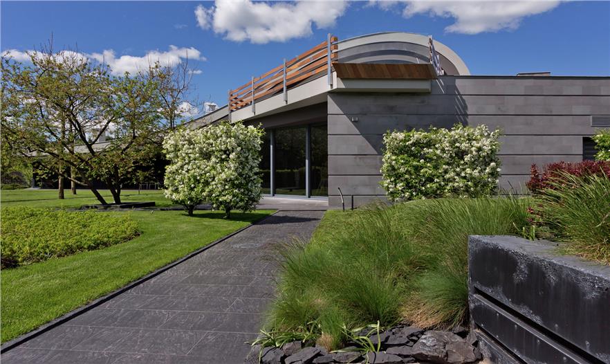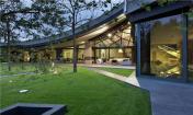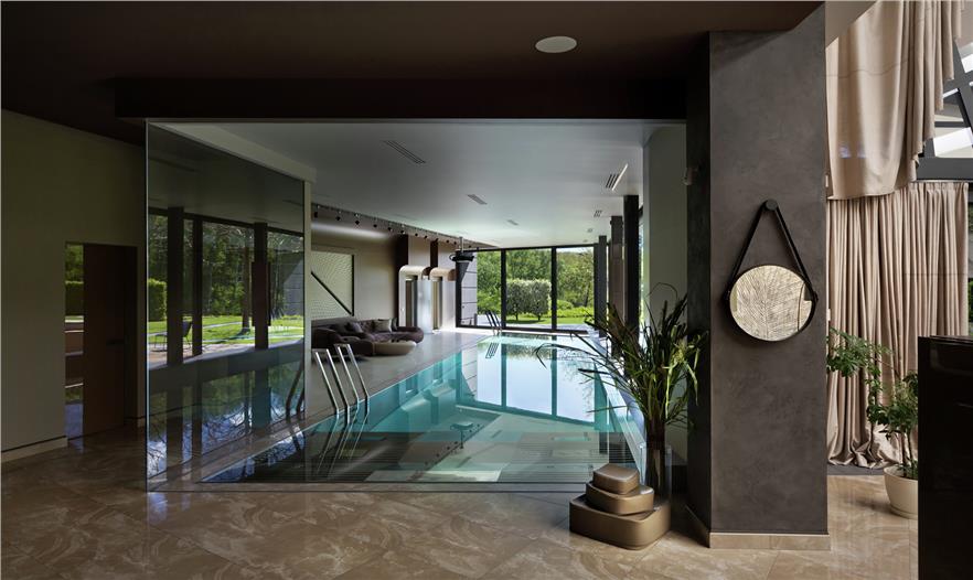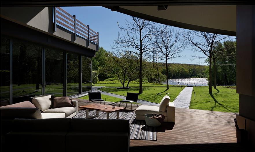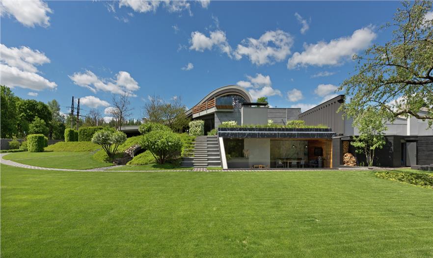這座帶有波浪形屋頂?shù)姆孔邮菫橐粋€(gè)有兩個(gè)女兒的家庭設(shè)計(jì)的。房子位于哈爾科夫地區(qū)一個(gè)風(fēng)景如畫的地方。因此我們的任務(wù)是創(chuàng)造一個(gè)與自然相融合的房子。房子里幾乎每個(gè)空間都能看到白樺樹林和湖泊的美麗景色。外墻采用了玄武巖石材,熱灰和玻璃的組合結(jié)構(gòu)。在一樓有一個(gè)不銹鋼游泳池,水面上還能看到天空和樹木的倒影。由于窗戶建在了屋頂,白天在客廳里有光與影伴隨著我們一起玩耍。懸臂屋頂露臺(tái)八米長,在任何氣候環(huán)境下都顯得很舒適。該地的景觀非常實(shí)用和整潔。房子前面的梓樹為炎熱的天氣提供了陰涼,湖泊也是清晰可見。最初在該地有15米的高度差,所以我們決定將其分為2個(gè)平臺(tái)。其中一個(gè)平臺(tái)設(shè)置了一個(gè)涼亭和兒童玩的石洞。它成為了家庭成員和他們的朋友最喜歡的地方。