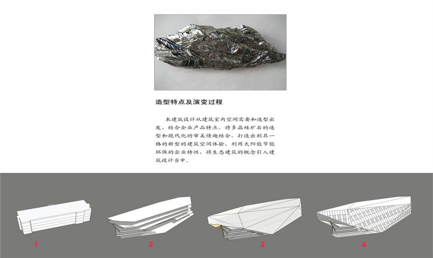 國(guó)電寧夏太陽(yáng)能公司是以多晶硅為主要產(chǎn)品的企業(yè)。多晶硅的需求主要來(lái)自半導(dǎo)體和太陽(yáng)能電池,是高集成的高科技產(chǎn)品。因而從辦公樓的建筑上我們不但能讀出一個(gè)大國(guó)企的氣度,更能看到高科技的內(nèi)涵。建筑外形充分結(jié)合了企業(yè)產(chǎn)品特點(diǎn),將多晶硅礦石的造型和室內(nèi)空間需要相結(jié)合,同時(shí)利用了太陽(yáng)能節(jié)能環(huán)保企業(yè)特性,將生態(tài)建筑的概念引入建筑設(shè)計(jì)當(dāng)中。