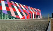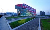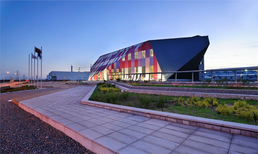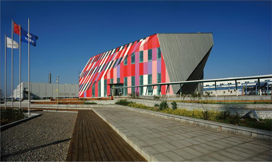 寧夏身居西北內(nèi)陸,地處中溫帶干旱區(qū),大風(fēng)、沙塵暴天氣出現(xiàn)次數(shù)較多。因而建筑立面是由現(xiàn)代感很強(qiáng)的合金鍍鋅波紋板,以不同的顏色,和獨(dú)特的造型特點(diǎn)拼接而成。這種材料不但能防止風(fēng)沙腐蝕,更能讓金屬色彩烘托出現(xiàn)代化企業(yè)的高科技性質(zhì)。鮮艷的紅色,使建筑從周邊灰黃的環(huán)境中跳出來(lái),成為了此區(qū)域當(dāng)之無(wú)愧的視覺(jué)焦點(diǎn)。西側(cè)的立面網(wǎng)狀結(jié)構(gòu)看似平淡無(wú)奇,其實(shí)是一塊神奇的生態(tài)綠化的區(qū)域。在春夏季節(jié),可以實(shí)現(xiàn)立體綠化的效果,使得建筑更加和諧融入自然。