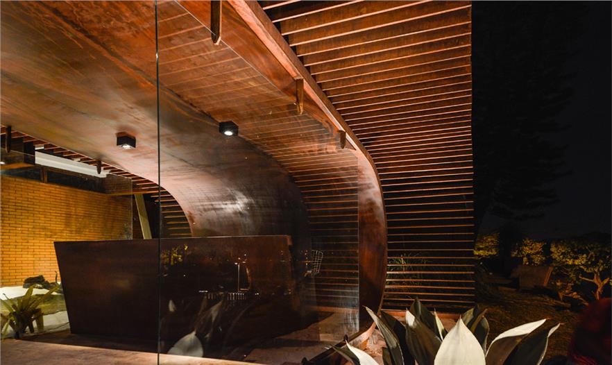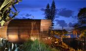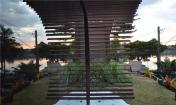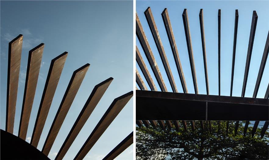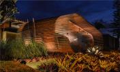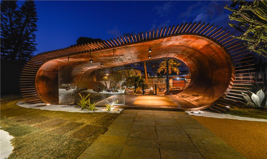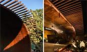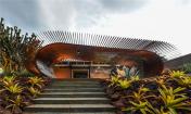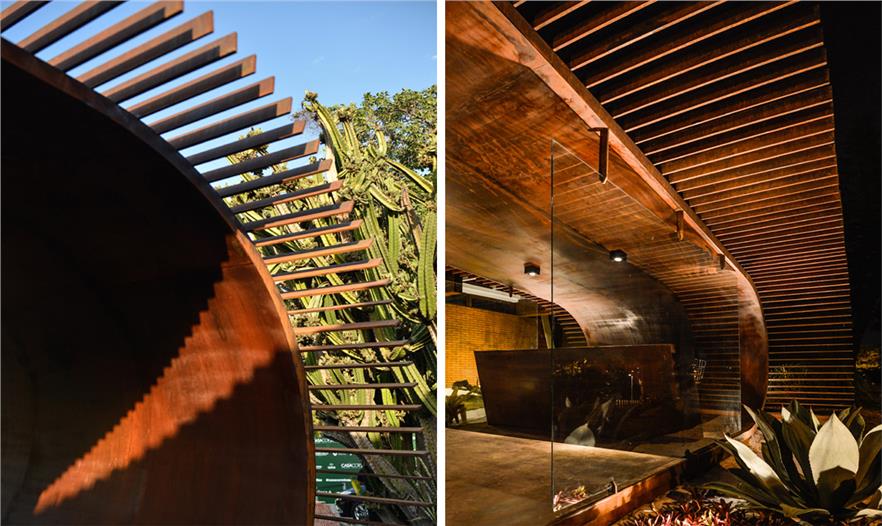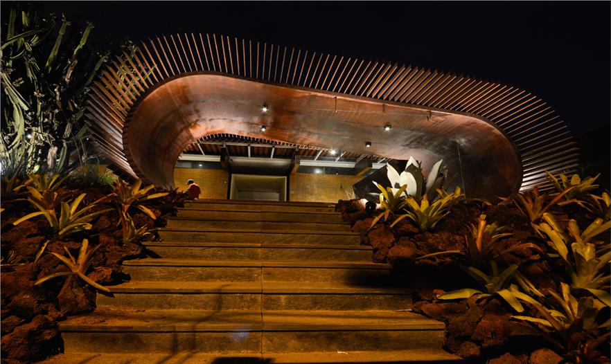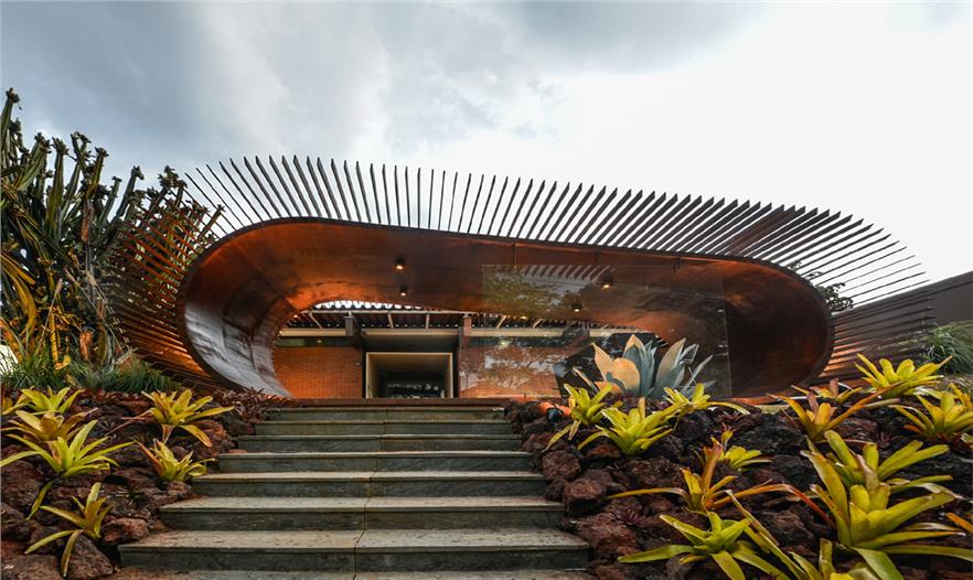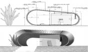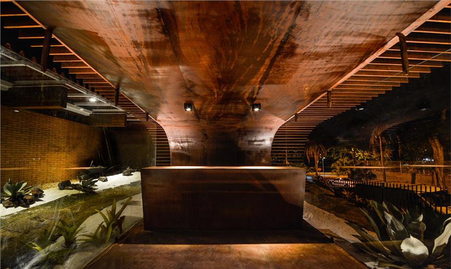 這些板塊被塑造成橢圓形,呈現(xiàn)三條相互平行的1米寬的帶狀結(jié)構(gòu),并利用四個(gè)3.0 x 10.0厘米的方型梁支撐。整個(gè)表皮覆蓋了450,00 x 10.0 x 1.0 厘米的板條,以提供屋頂遮陽。整個(gè)建筑的所有板塊均為2毫米厚。該館的連續(xù)有機(jī)結(jié)構(gòu)對(duì)未來尼邁亞的有機(jī)建筑是一個(gè)參考?;▓@繞館如今面對(duì)著兩個(gè)現(xiàn)實(shí)。前方草原的草以及鳳梨等植物定下了鄉(xiāng)村的氛圍,很好地保持了水分。后方龍舌蘭、石頭以及大理石粉末所造就的氛圍是干燥的,警醒人們未來水資源短缺的后果。