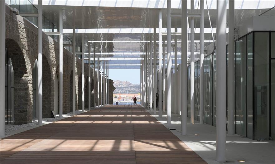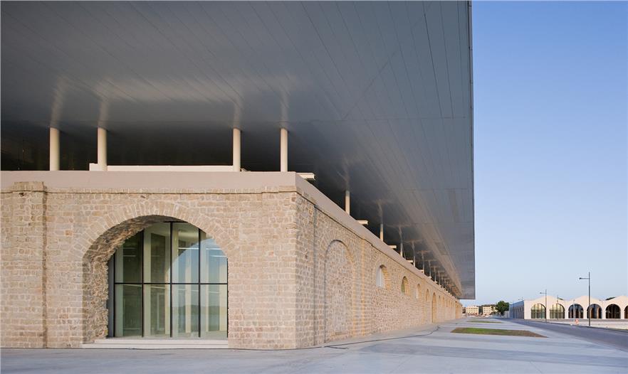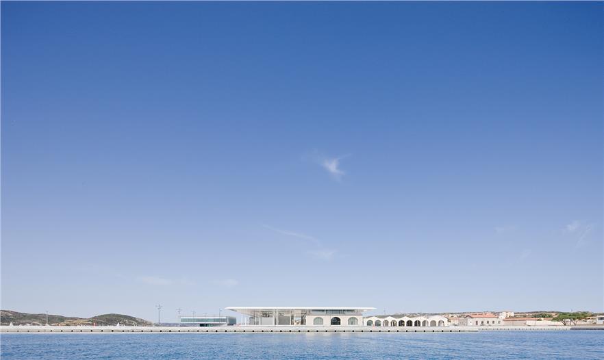 這座花崗巖制成的拱形建筑曾經(jīng)是供拉馬達(dá)萊納當(dāng)?shù)氐能娪秘涇囮?duì)??克玫能娦邓?,而現(xiàn)有的這座建筑的設(shè)計(jì)過程就好像是現(xiàn)代和歷史對(duì)話的一個(gè)過程,既有著設(shè)計(jì)上的發(fā)揮,同時(shí)也做好了對(duì)歷史的傳承。現(xiàn)在這座建筑被改為了一個(gè)巨大的展覽及活動(dòng)中心,其中將會(huì)舉辦商業(yè)活動(dòng)、展覽、教育活動(dòng)、海洋及旅游活動(dòng)等各種各樣的活動(dòng)。這個(gè)開闊的空間有著一個(gè)足足一萬平米的巨型白色頂棚,鳥瞰起來就如同沙灘一般,層高則有10米,并且建筑大量配備了光伏電池以供其電能所需。這個(gè)設(shè)備,連同熱交換系統(tǒng)可以對(duì)海水進(jìn)行加熱和或者冷卻建筑物,其太陽(yáng)能電池板的可生產(chǎn)熱能,形成一套“自己自足的能源體系”。該項(xiàng)目可以說是一個(gè)可持續(xù)開發(fā)的實(shí)踐,它將調(diào)整地中海馬達(dá)萊納群島第一無二的自然環(huán)境并保護(hù)其生物多樣性及秀麗的景觀。