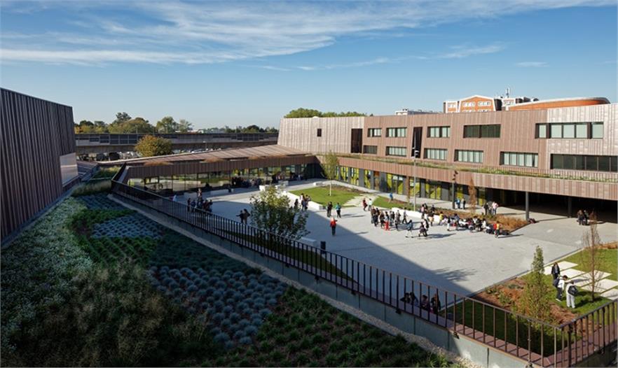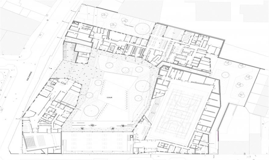 三個(gè)碎片式的體量,對(duì)外開口的面積很大,讓整個(gè)建筑看上去更輕盈。半開放的操場朝向北側(cè)的城市街區(qū)開口,提供了眾多的視野;同時(shí)還面向南側(cè)的主要城市景觀和架空的城鐵系統(tǒng)。d’Alsace大街沿街的透明乒乓球室凸顯了學(xué)校向城市的開放度,通過與rue d’Arras路上的宿舍入口相連接,開放的程度被再次加強(qiáng)。