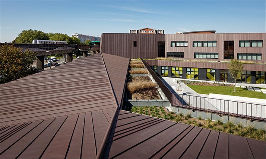 新的里爾穆蘭初級(jí)中學(xué)和它的殘疾人體育館,占據(jù)著街道一角,面對(duì)d’Alsace大道,沿著rue d’Arras延展開來。該地點(diǎn)提供了一個(gè)明顯的面向穆蘭區(qū)開口,需要考慮到從臨近方位看新建筑的感受。由此生成兩個(gè)兩個(gè)不同層面的視覺尺度:一方面,從遠(yuǎn)處看建筑的體量和屋頂提供了某種難以捉摸的感受;另一方面,建筑與環(huán)境緊密結(jié)合,提供了從地面層和入口看向路人和居民的視線。將這種雙重的尺度轉(zhuǎn)譯到建筑上來,造就了一座既滿足城市和象征意義維度的,又符合功能要求的建筑。