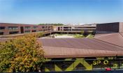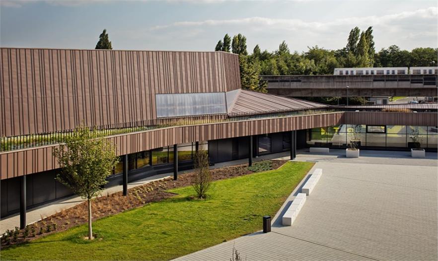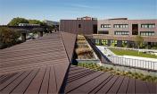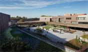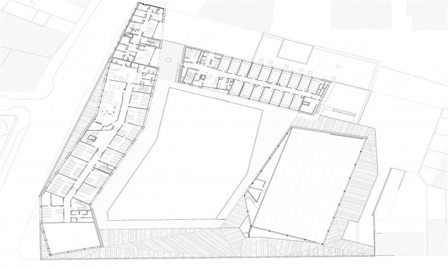 體育館圍繞著中央庭院成環(huán)狀,在里爾的天際線上清晰地勾勒出自己的輪廓。透明的地面層對(duì)外界展示了極大的開放性,保證了整個(gè)項(xiàng)目的視覺連續(xù)性。學(xué)校上部的造型則更多地被視為城市的標(biāo)志性建筑來處理。體量間的相互作用使得幾個(gè)主要元素(學(xué)校、學(xué)校宿舍、殘疾人體育館、文化中心)能夠很容易地辨別出來,同時(shí)也以相對(duì)分散地肌理與當(dāng)?shù)氐沫h(huán)境融合地更密切。一條水平向的長條位于地面層和上部樓層之間,將所有的體量聯(lián)系起來,同時(shí)為庭院提供遮蔽。長條上方種植植物,形成綠色的環(huán)帶。