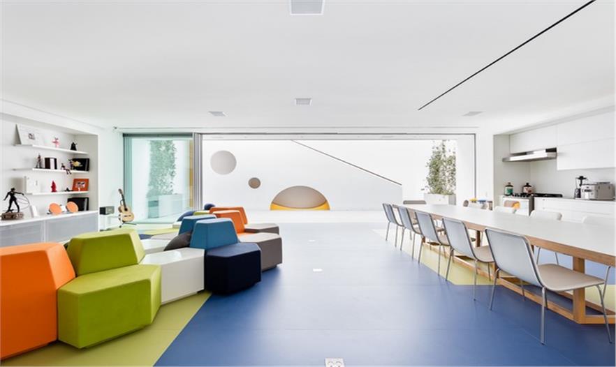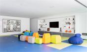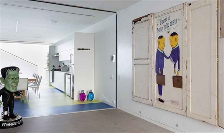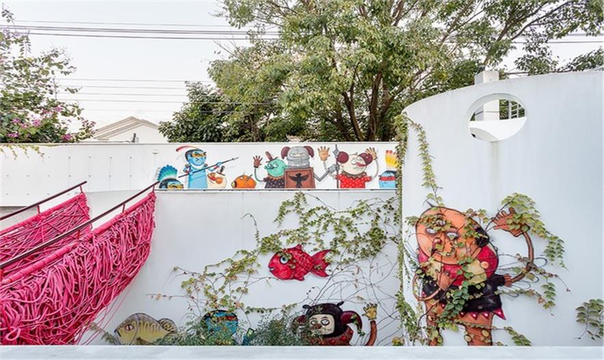 當(dāng)步入這里后,趣味性便開始呈現(xiàn),首先你會看到由雙胞胎藝術(shù)家OSGEMEOS創(chuàng)作的涂鴉作品——“外面的世界很無聊”。Toy House MM01共三層,一層是一個類似起居室與餐廳的大空間,有許多五顏六色的座椅,這里看樣子非常適合開party。空間雖簡單,卻由于許多藝術(shù)品的存在讓處處充滿了生氣與趣味。