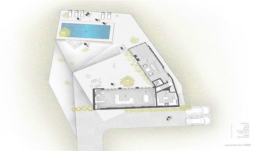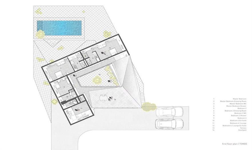 印度建筑事務(wù)所Note-D在該國西部的馬哈拉施特拉邦一座名為阿利巴格的城鎮(zhèn)附近,建成了一座奢華的住宅。該地區(qū)距離首都孟買只需乘船走短程的水路,很快將成為大受歡迎的周末休閑度假之所。本案名為“Tomoe別墅”,以典型的印度庭院住宅構(gòu)型為基礎(chǔ),這種住宅在采光與通風(fēng)方面均有利于人們在熱帶氣候下生活。中央廣場的設(shè)計解決了室內(nèi)外空間邊界的問題,因而形成的螺旋狀幾何形式也形成了一連串封閉的遮陽體量。該住宅包含起居室、六間臥室、花園、露臺和一個游泳池。住宅的私人區(qū)域位于一層,設(shè)備間位于地下室。程式化設(shè)計的戶外空間,譬如夾層上的涼廊都是有規(guī)律地排布的,在庭院內(nèi)走動就能看到,保持了一種各個樓層的視覺銜接。