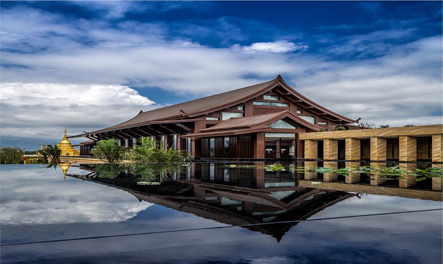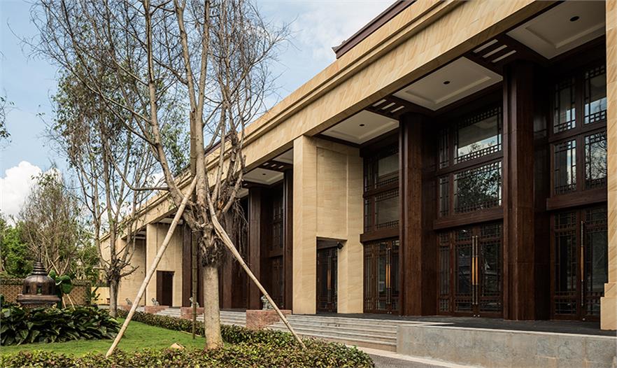 酒店整個公共區(qū)建筑以傣族高聳的屋頂為基本元素,大面積的石材基座加之大堂、大堂吧及全日餐廳的單體木構(gòu),組合成宜人尺度的院落空間。室內(nèi)精細多層次的木結(jié)構(gòu),與室外現(xiàn)代精致的景觀相呼應(yīng),將風(fēng)景引入室內(nèi)空間,并形成極佳的景觀視野。到達區(qū)半透空柱廊與無邊水池?zé)o縫融合,與中心花園形成軸線景觀。既有面對未來,現(xiàn)代建筑形式的豐富多姿,又尊重歷史,體現(xiàn)當(dāng)?shù)厣贁?shù)民族建筑的文脈相承。