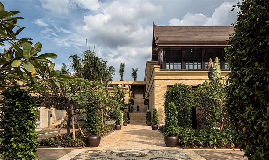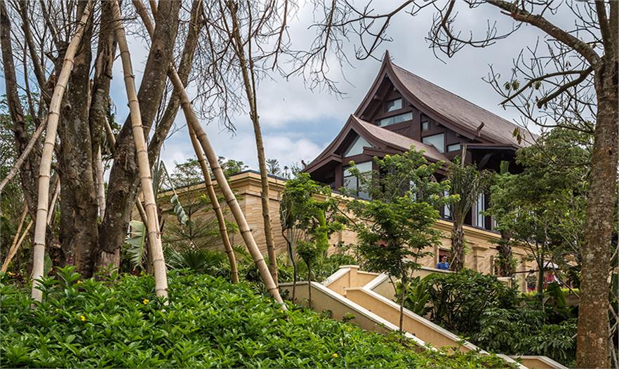 依山而建的文華酒店如同掩映在雨林綠樹中的隱秘王宮,圍繞佛塔次第展開,處處尊貴典雅又親近貼合自然,在這里客人可以同時體驗鮮明的異域風(fēng)情生活方式和濃厚的當(dāng)?shù)刈诮涛幕諊?,配以酒店傣族特色的設(shè)施與頂級的服務(wù),而獲得無以倫比的度假感受??兹?、瑞象、蓮花都是傣族最具代表性的圖騰標(biāo)志和宗教符號,也是傣族民族精神的象征,酒店建筑裝飾細節(jié)及各處的景墻、鋪裝,充分體現(xiàn)出這種獨特的以自然生物與文化符號形成的主題元素。酒店建筑群體以版納傣族傳統(tǒng)村落為型,因地制宜,隨山采形,結(jié)合當(dāng)?shù)貍鹘y(tǒng)文化,加以現(xiàn)代構(gòu)成手法,體現(xiàn)出獨具創(chuàng)意的民族的、自然的、文化的建筑空間之美。