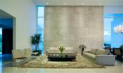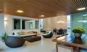 在U型通道上,你可以通過(guò)階梯或坡道到達(dá)屋里。室內(nèi)有許多用于用餐和娛樂(lè)的起居空間。起居室有一面大型墻壁,被窗戶環(huán)繞著,劃分出座位區(qū)。