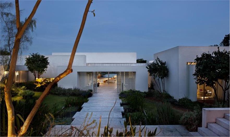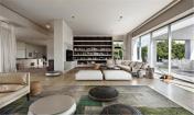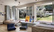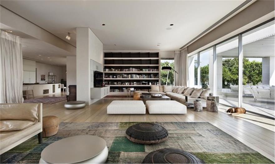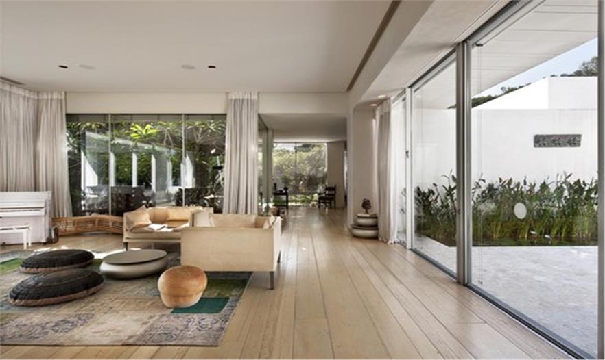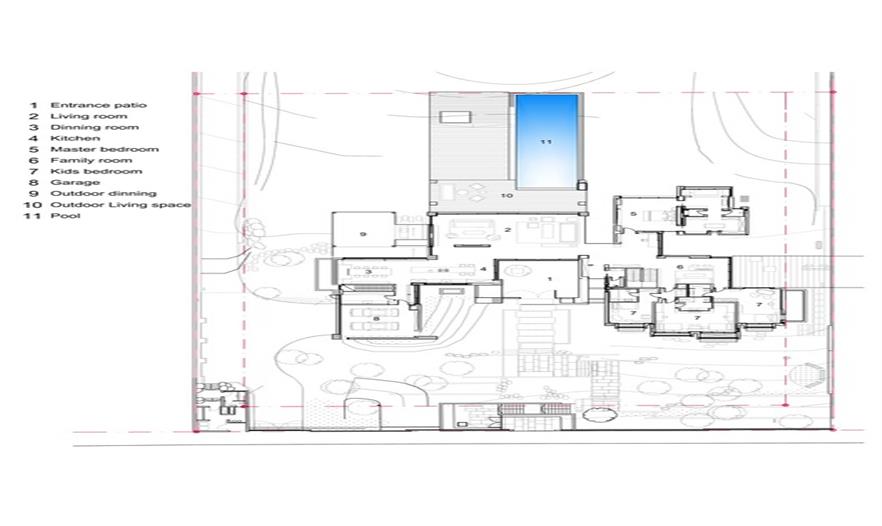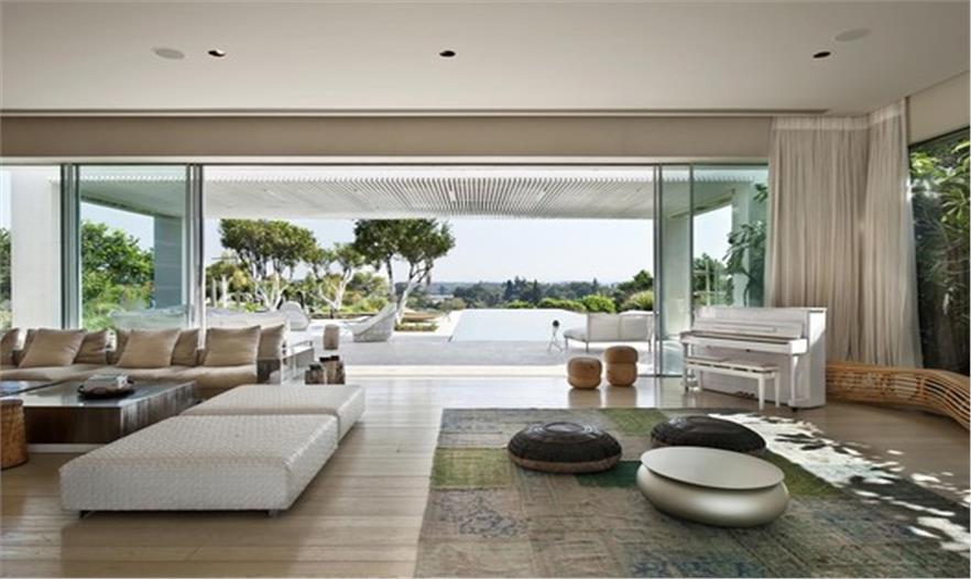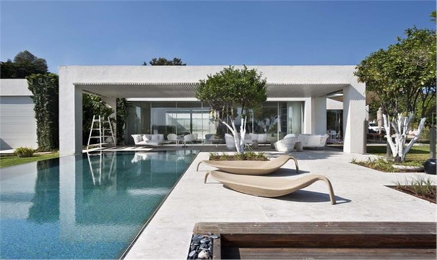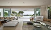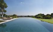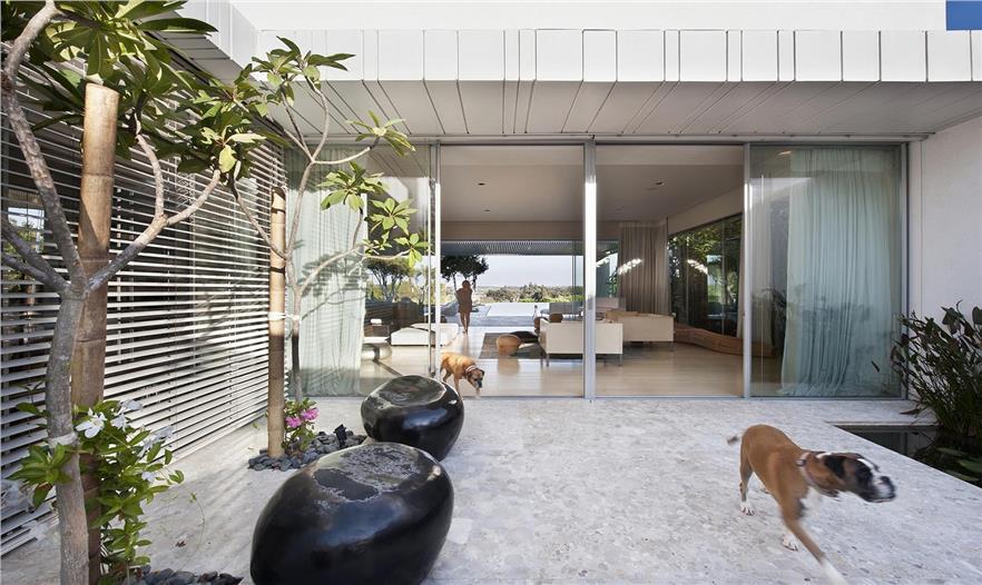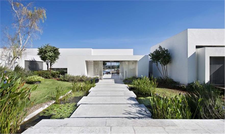 在一片橄欖樹林的背后是一個寬敞的入口處,在這里你可以自由選擇去向。在入口通道的末端,經(jīng)過魚塘后,你會來到一個手工藝金屬門前。在大門后面,一個室內(nèi)地中海庭院將內(nèi)部所有東西呈現(xiàn)在眼前。因此游客可以自由的漫步其中。這里沒有正式的入口處,也沒有前門。主空間是隨著沒有端界的泳池地平線的出現(xiàn)而瞬間開放。