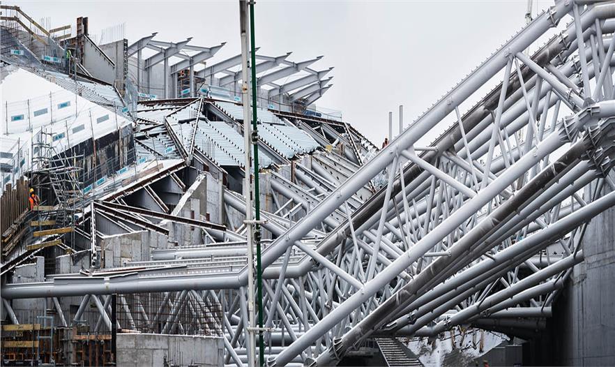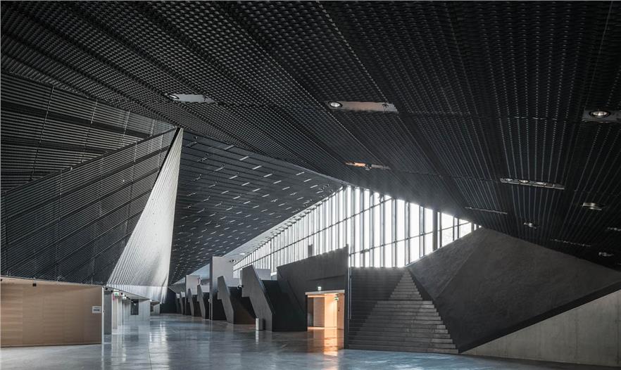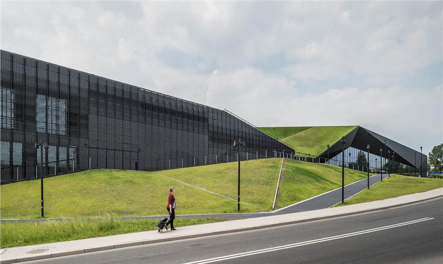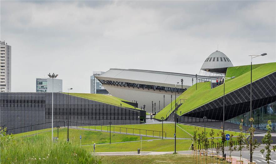 這一理念導(dǎo)致了建筑的形成,其核心構(gòu)成要素是屋頂(綠色區(qū)域),整合入土坡和自然地形多樣性的系統(tǒng),并在下面大廳/門廳之下,以吊頂變形的優(yōu)點(diǎn)作為一個(gè)獨(dú)特的功能,“綠色區(qū)域”形式的反相。結(jié)構(gòu)形狀這種方式滿足了無論是它的重要性和對聲望的期待,由需求使其成為Spodek競技場周圍景觀的一部分,競技場仍然是城市這部分空間的主要標(biāo)志性建筑。