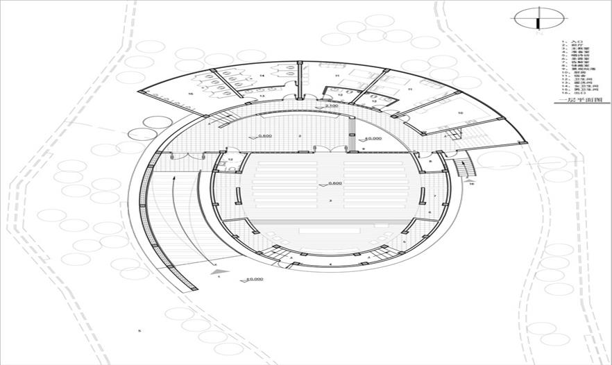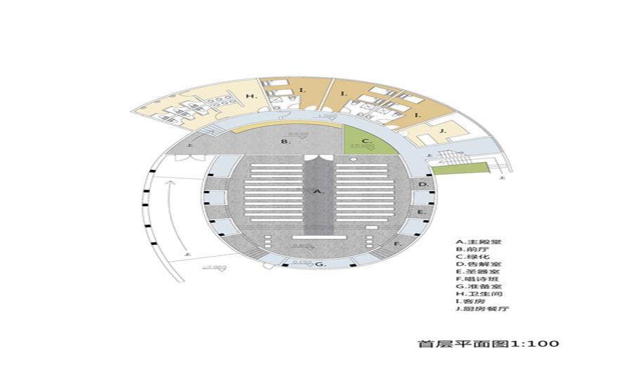 建筑功能包括主神堂、神父和修女宿舍、及輔助功能如會議室、廚房、餐廳等,所有的輔助用房朝向湖面景觀,主神堂是由一圈螺旋曲線形成的一個空間序列:從彎曲走廊進(jìn)入連接輔助功能空間的神殿前廳,主神堂、內(nèi)庭院、前廳都是不同空間的緩沖帶,人們可看見并被引向主神堂。